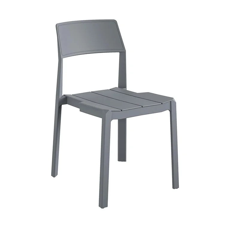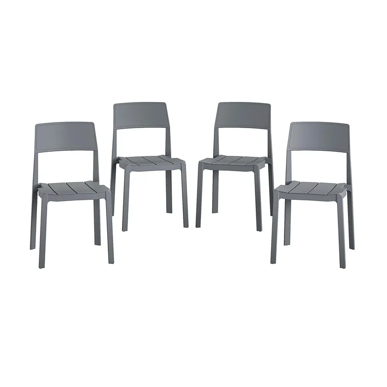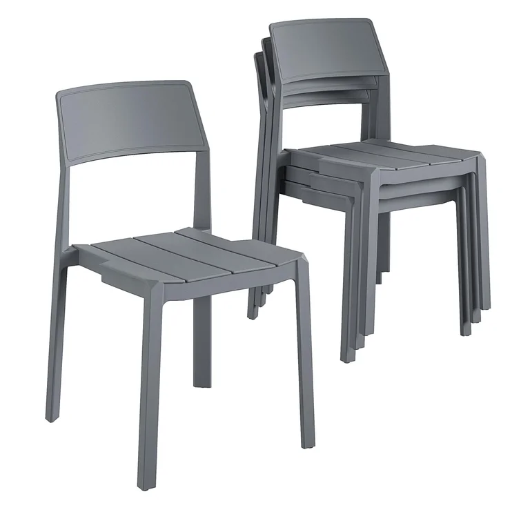 - The set includes 4 stackable resin chairs and 2 metal tables