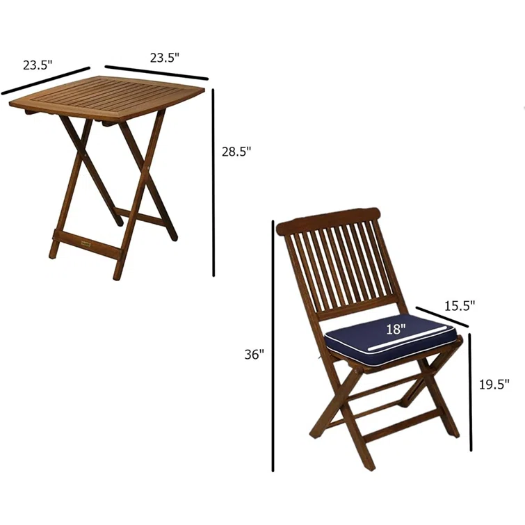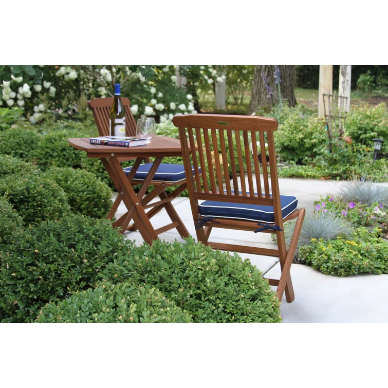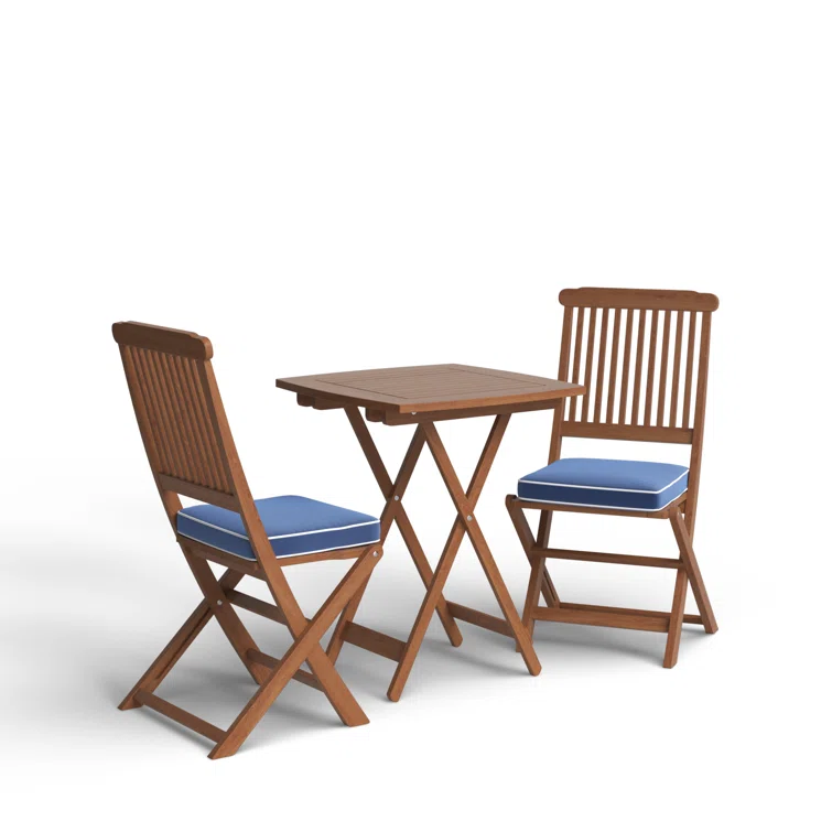 This classic patio bistro set creates a cozy alfresco dining area with a timeless look. It includes two chairs with slatted backs and a side table, all foldable for easy storage and simple setup. Each is crafted from solid eucalyptus wood, kiln-dried for durability, in a natural brown hue. We love that the chairs come with foam-filled cushions for some extra comfort – plus, they're removable if you want to customize with your own. Safe for everyday outdoor use, this set is resistant to weather, water, and UV rays.