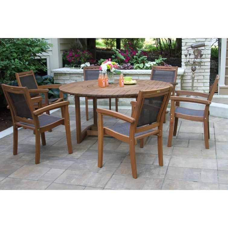 This 7-piece outdoor dining set creates an inviting space for alfresco meals and cozy get-togethers. It includes a round dining table and six stackable armchairs, each piece crafted from weather-resistant solid eucalyptus wood with a warm brown finish. The table features a built-in lazy Susan (so sharing appetizers is a breeze) and an umbrella hole (to allow for a shaded space to hang out). All of the chairs have sling seats and backs for a breathable backyard relaxation experience.