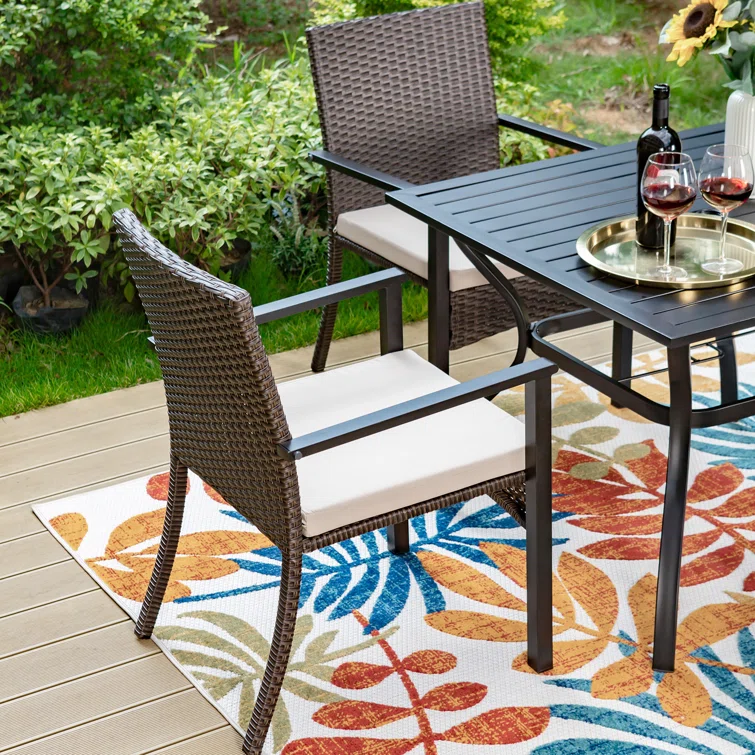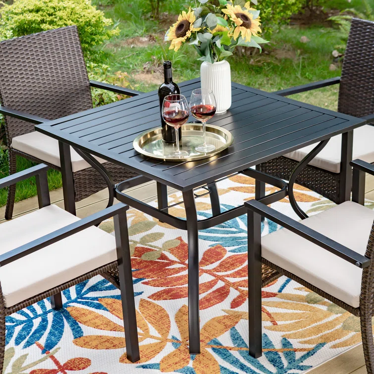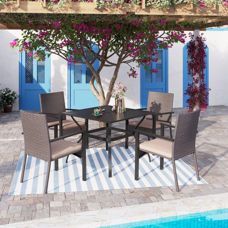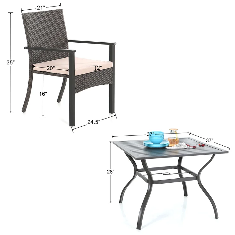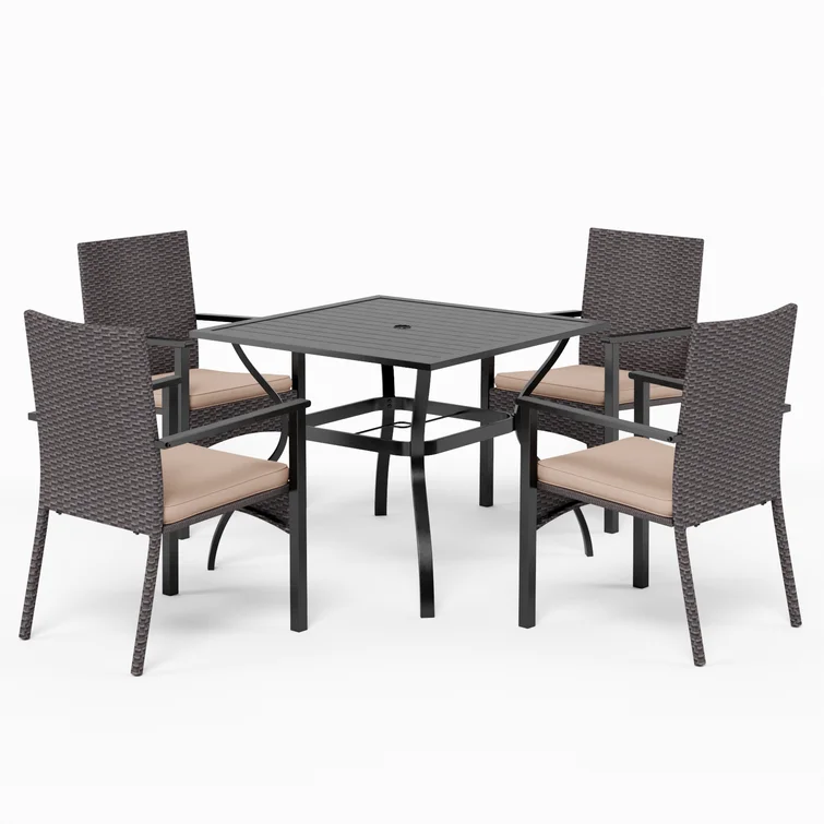 This 5-piece patio set includes 4 rattan chairs with removable cushions and 1 metal square table. The whole set accommodates 4 people to use it both indoors and outdoor like patio, porch, garden, and poolside. The holiday sense of overall look delivers relaxing vibes to your patio, and garden places. The rattan-covered furniture set is so modern and classic, also the best decoration for your home.