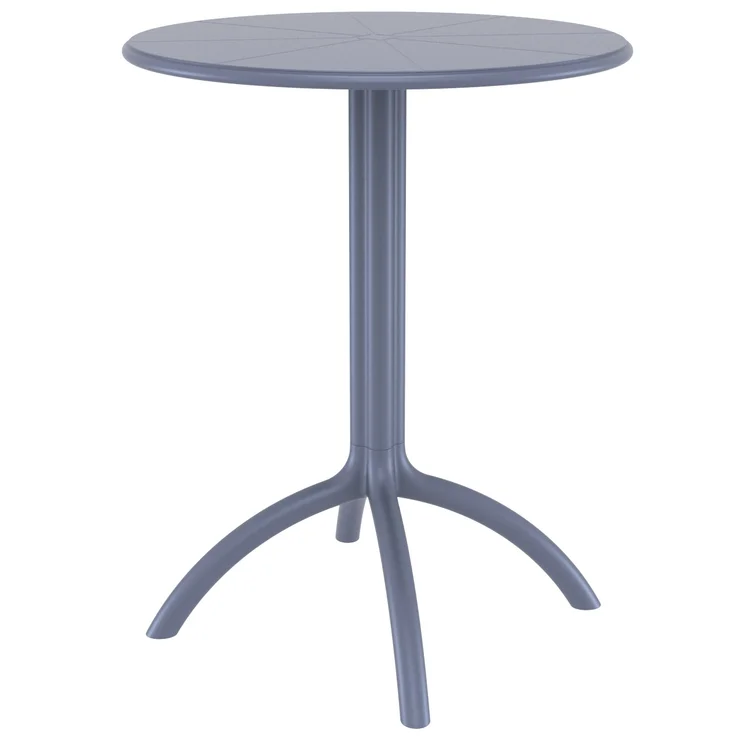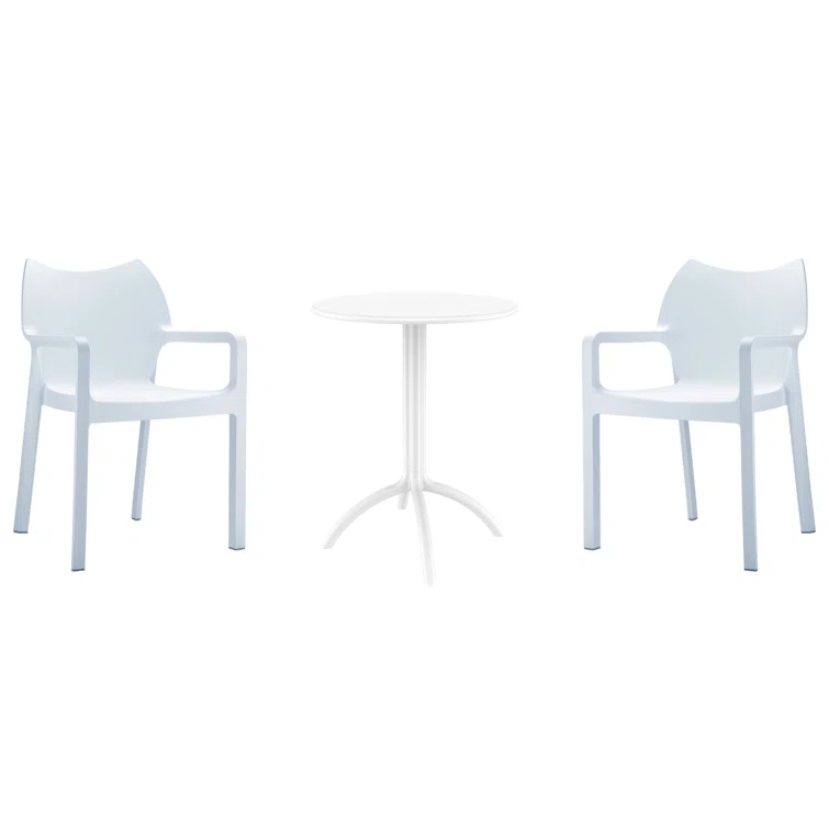 Bistro set with comfortable dining chairs and a round table. Great for outdoor spaces, patios and decks. Used by restaurants, cafes and hotels. Chairs and table are made from marine grade polypropylene. Stackable chairs are super sturdy with commercial strength.