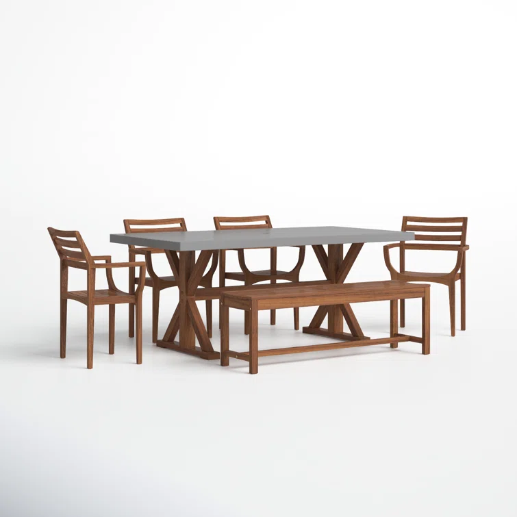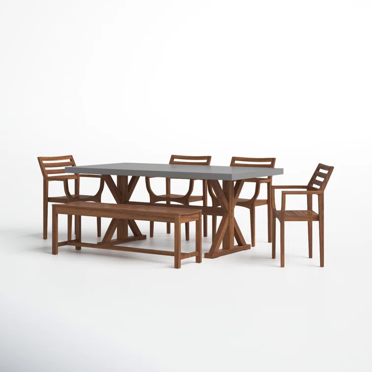 This 6-piece outdoor dining set creates a welcoming space for you and your guests to enjoy al fresco meals. It accommodates up to seven people and includes a rectangular table, four stackable, ladder-style chairs, and a backless bench. The table features a composite top made from molded polyresin blended with powdered concrete for a textured look, and it has an umbrella hole with a matching plug. The chairs with curved arms and the single bench are crafted from solid eucalyptus wood, offering a natural wood grain color variation. Plus, this dining set is weather-, water-, and UV-resistant, so it stands up to the elements. For daily cleaning, simply wipe the set with a moist towel.
