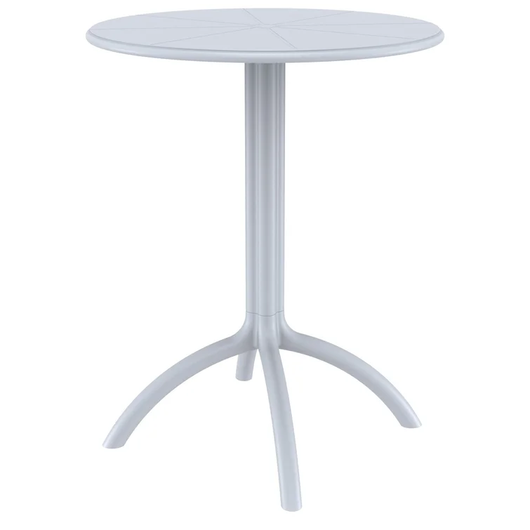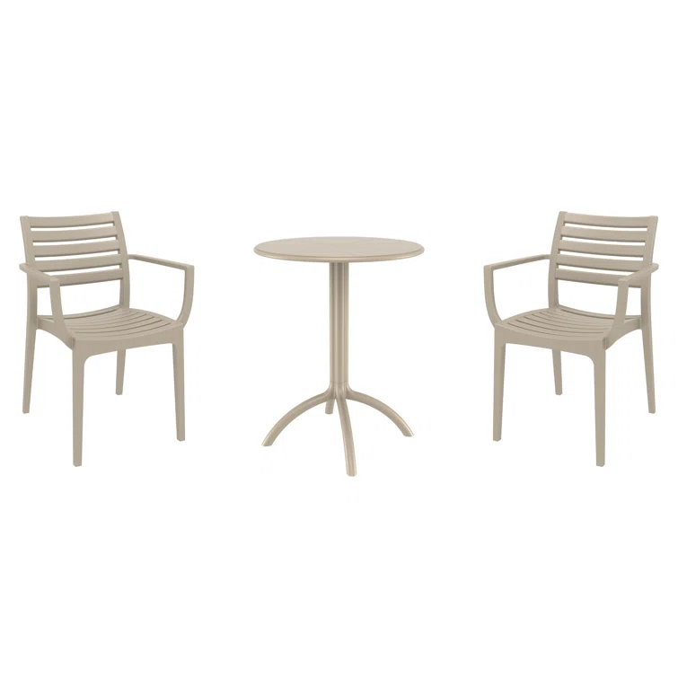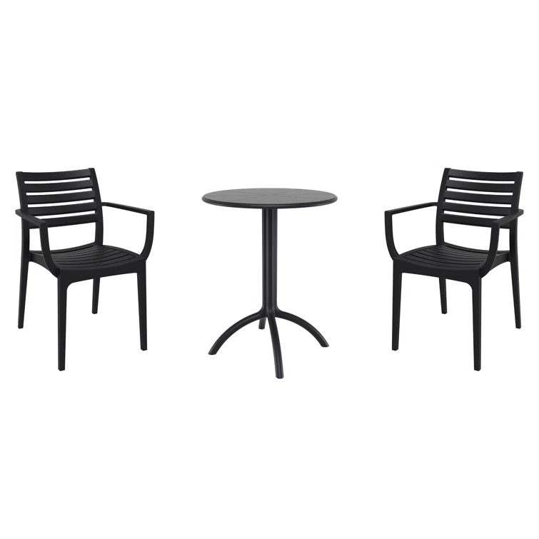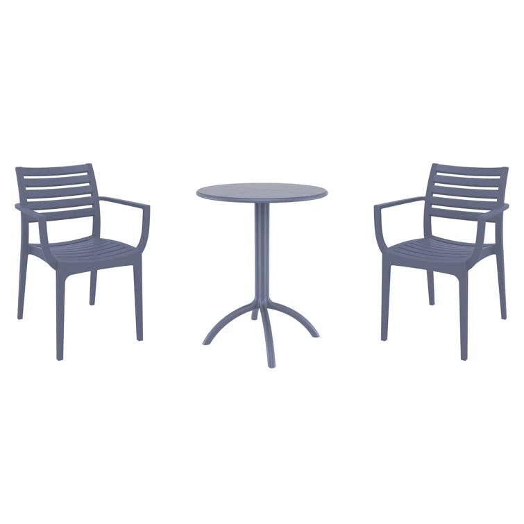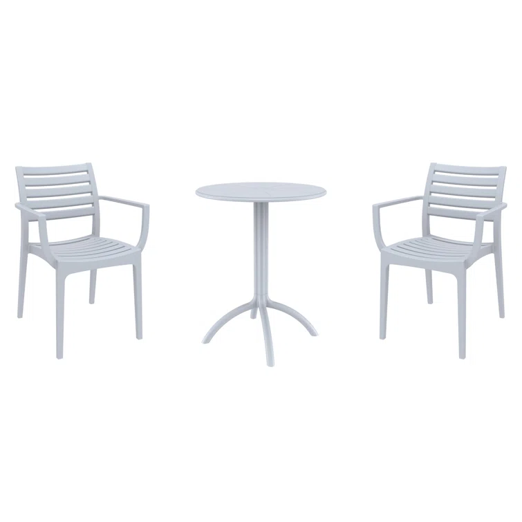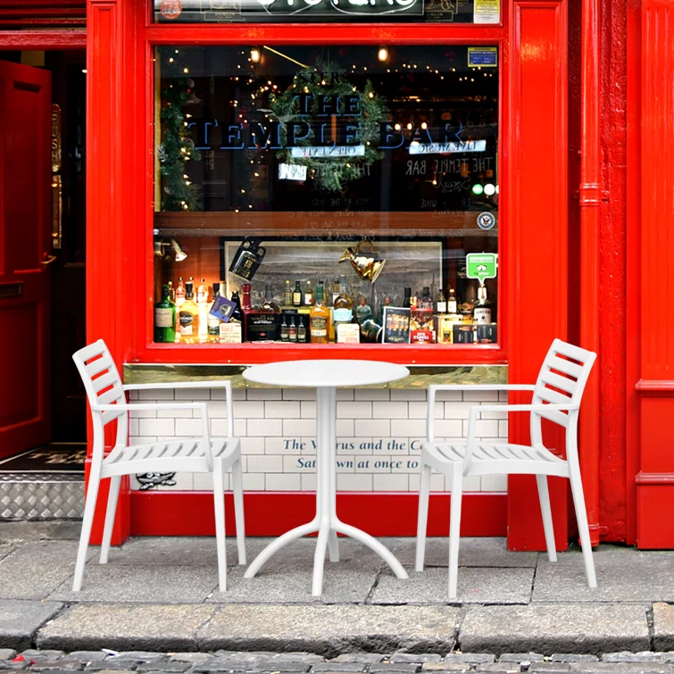 Bistro set with comfortable dining chairs and a round table. Great for outdoor spaces, patios and decks. Used by restaurants, cafes and hotels. Chairs and table are made from marine grade polypropylene. Stackable chairs are super sturdy with commercial strength.