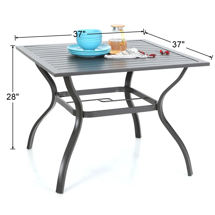 - Practical dining table: Coming with a square all-steel frame patio dining table that is durable and easy to clean. Powder-coated technology effectively keeps air and water away from steel plates so that our furniture has a high rust resistance, and the gap between each table plate allows rainwater to pass through to ensure the dining table set’s durability.