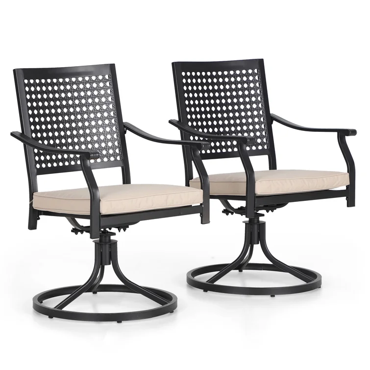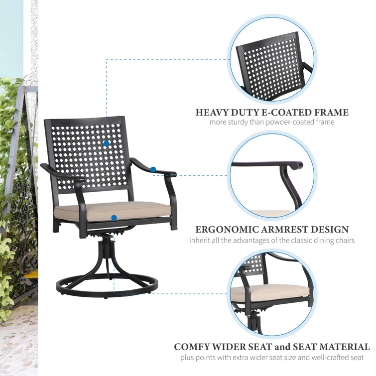 Our 360°- degree swivel dining chairs are designed with a grid-shaped back. The unique mesh lattice design adds a dash of elegance to this outdoor dining chair. There is no better way to blow off some steam after a tiring day, than getting a nice cup of coffee or cocoa, along with your favorite magazine or book, and sitting comfortably on your new outdoor dining chair.