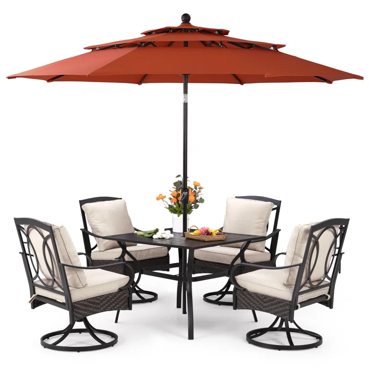 Transform your backyard into an elegant outdoor dining area with this dining set. This set includes one square dining table, four dining chairs and one outdoor umbrella. Durable steel frame treated with multi-steps to prevent rust, three layers inside the cushion to ensure comfort, 100% olefin fabric to make sure quick-drying and waterproof. The patio umbrella is large enough to block the sun and bring coolness for you. With this set of furniture, you could enjoy the gathering of your family or friends at any time in your deck, garden or backyard.