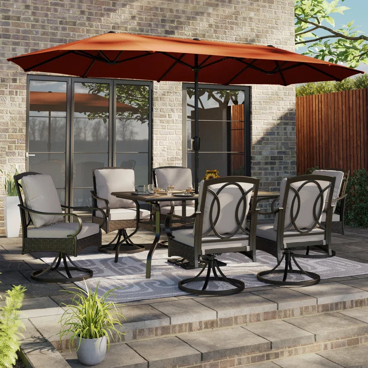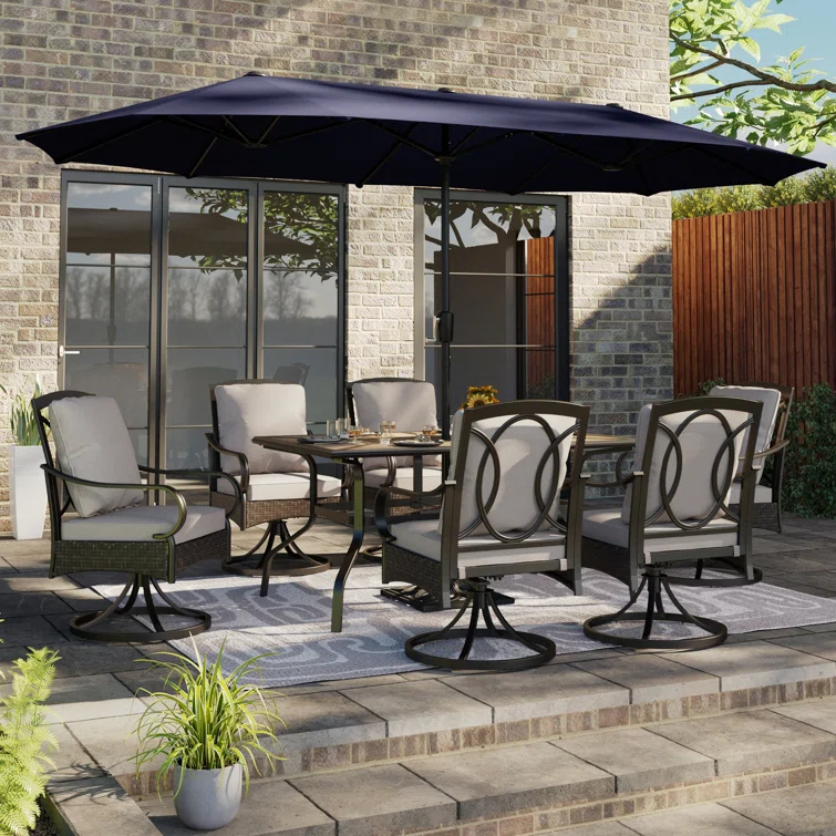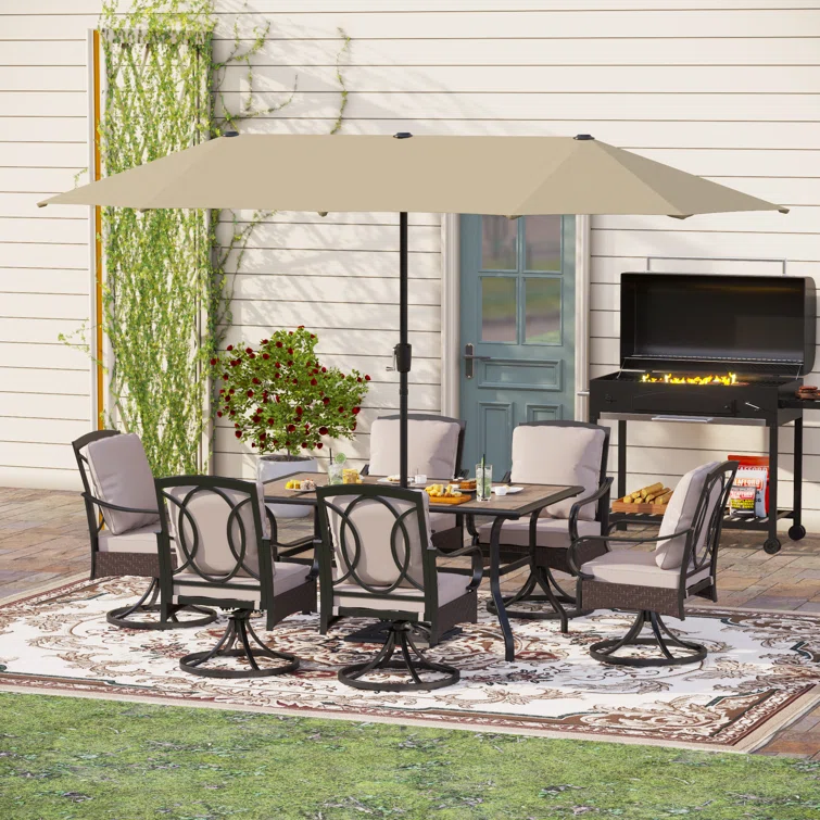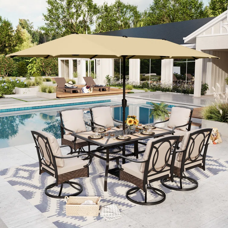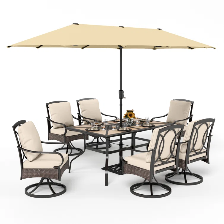 8-piece patio dining set with cushions and an umbrella is ideal for your outdoor room. E-coated and powder-coated steel frame, 100% polyester fabric of cushions ensure the durability and sturdiness of the set. The patio umbrella is large enough to block the sun and bring coolness. With this set of furniture, you could enjoy the gathering of your family or friends at any time on your deck, garden, or backyard.