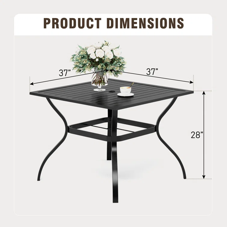 - Practical dining table: Coming with a square all steel frame patio dining table which is durable and easy to clean. Powder-coated technology effectively keeps air and water away from steel plates so that our furniture has a high rust resistance, and the gap between each table plate allows rainwater to pass through to ensure the dining table set’s durability.