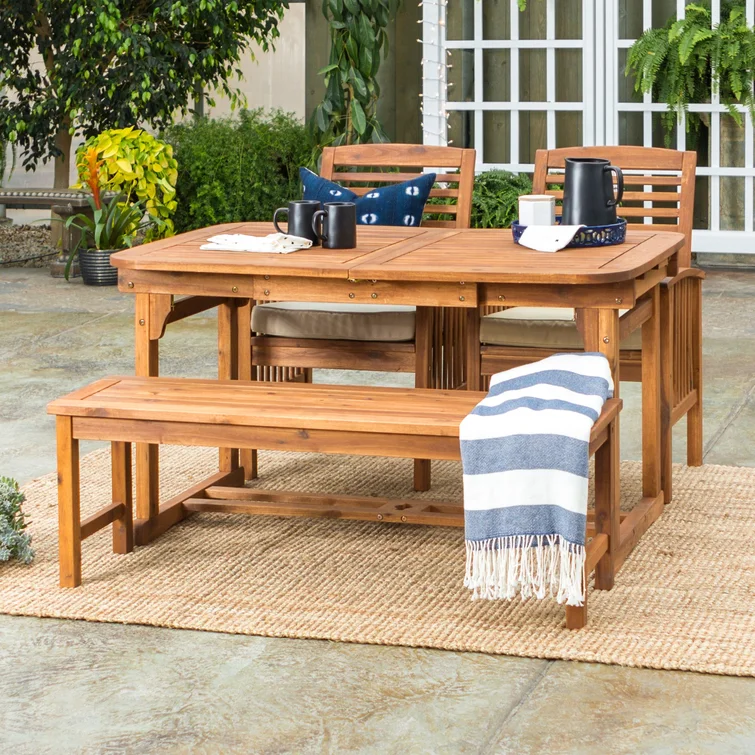 Classic and comfortable, you'll be impressed by this timeless outdoor patio dining set. The slat pattern on every piece provides a fresh and stylish take on outdoor furniture while the weather resistant cushions provide support. The table includes a butterfly leaf extension that has a hole that can accommodate an outdoor umbrella. This dining set includes one extendable table, one bench and two chairs.