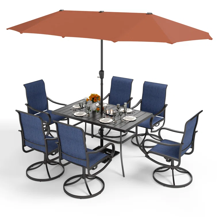 Elevate your outdoor leisure with our stunning 8-piece patio dining set featuring sturdy powder-coated steel frames that guarantee durability and protection against the elements. The ensemble is complemented by vibrant swivel chairs, upholstered in quick-dry PVC-coated polyester fabric that delivers both breathability and lasting comfort under the sun. Set the scene for unforgettable moments under the expansive canopy of the included oversized umbrella, shielding you from the heat while maintaining an air of sophistication. Perfect for hosting intimate gatherings or simply relishing a relaxing afternoon, this dynamic 8-piece set merges contemporary design with practicality.