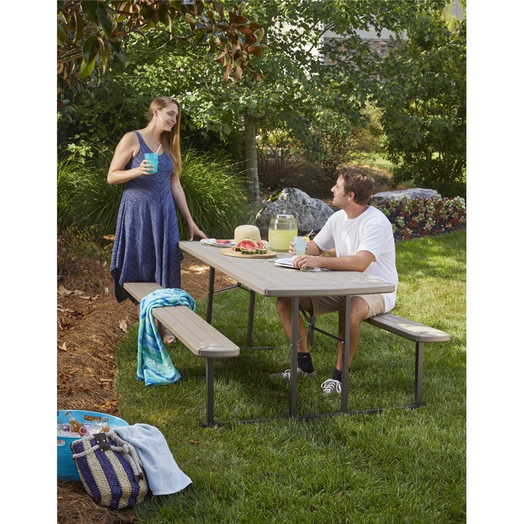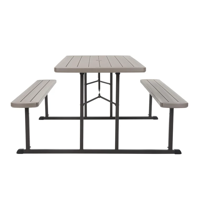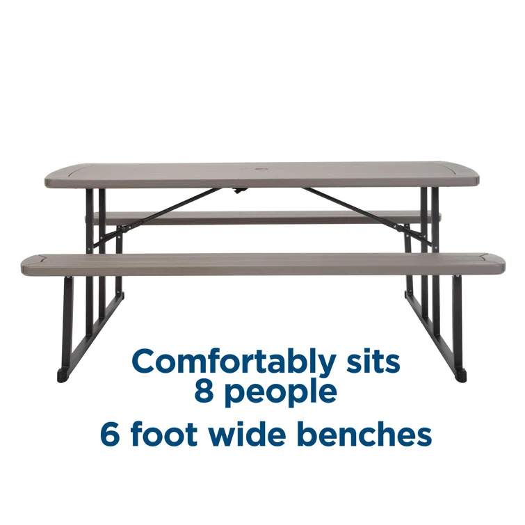 The COSCO 6 Foot Wood Grain Blow Mold Folding Picnic Table is a great addition to any backyard. Picnic table comfortably sits 8 people. Each bench has a weight capacity of 800 lbs. Product is easy to clean, durable, maintenance free. Constructed with a stable steel frame, the table is designed with dark gray, wood grain resin table top and benches . At the end of the season, the picnic table easily folds to store during the winter months. While folded, can also be transported. The table also includes an umbrella opening (umbrella sold separately). Minimal assembly is required. The COSCO INTELLIFIT collection of durable and affordable outdoor furniture folds, stacks, and nests to fit your space - no matter the size. From your backyard to your balcony, INTELLIFIT outdoor furniture enhances your home with space saving and price conscious practicality. COSCO Outdoor Living, a brand of COSCO Products, offers space saving folding groups to roomy conversation and dining sets, designed to meet all your outdoor patio needs. Our collections help create your own outdoor lounging spaces or cozy living areas on your patio or deck. Our outdoor products are designed with form and function in mind to help you create the outdoor space you dream of. Design aspects for COSCO Outdoor Living products include innovation, style, and elegance to suit any customer's home décor or design motif. Manufactured with durable, weather-resistant materials, our furniture is built to last and to impress. We offer different color options on multiple sets, making it easy to fit your personal taste. We invite you to sit back, relax and enjoy your COSCO Outdoor Living furniture.