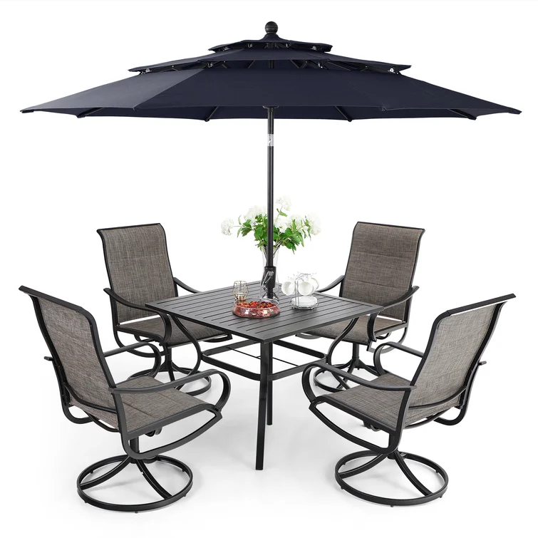 This 6-piece outdoor dining set gives you just the right spot to entertain on your patio or deck. It includes a square table, market umbrella, and four chairs, which are all made from powder-coated steel in a black finish. We love that this set is weather- and rust-resistant, so you can leave it outdoors season after season. The slatted table measures 37' long, so it comfortably seats four for weeknight grilling on the patio, and it has an umbrella hole in the middle to accommodate the included auto-tilt umbrella. Each swivel chair is built on a round base for easy mobility. Plus, the backs and seats are upholstered in sling polyester for a light and breezy place to sit on hot days.