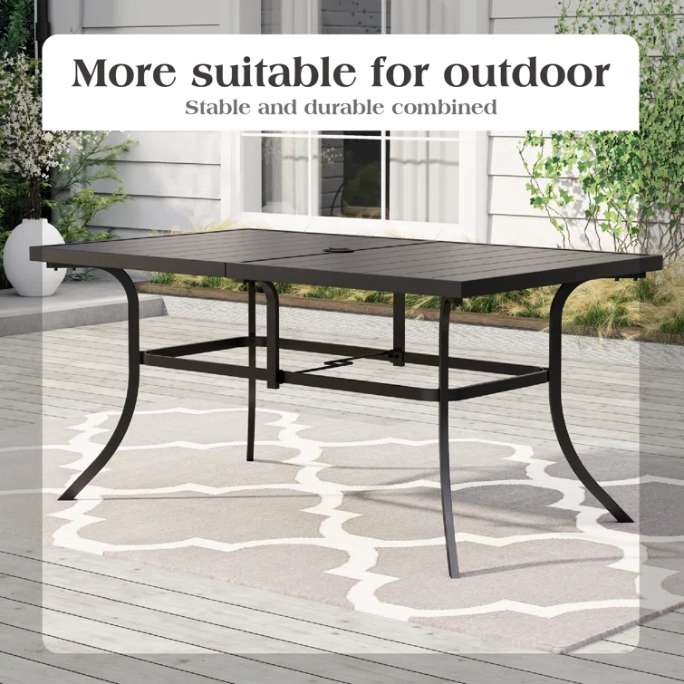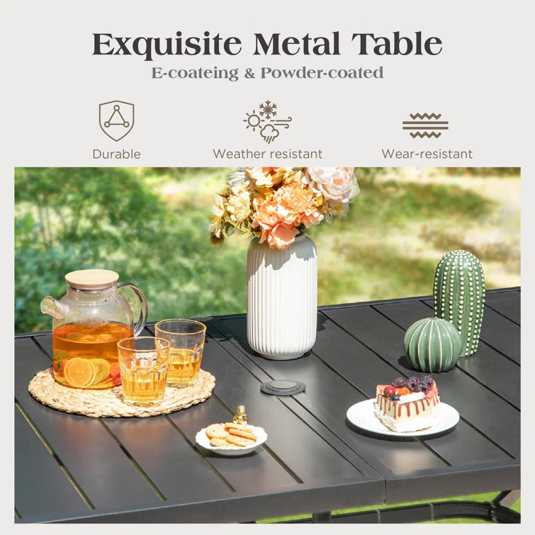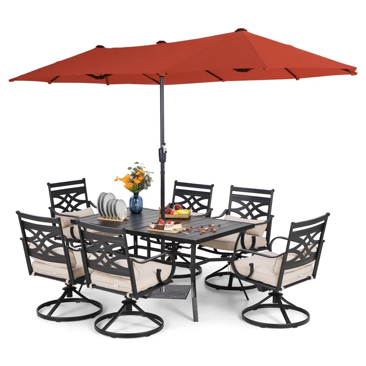 8-piece patio dining set with cushions and an umbrella is an ideal choice for your outdoor room. E-coated and powder-coated steel frame, 100% polyester fabric of cushions ensure the durability and sturdiness of the set. The patio umbrella is large enough to block the sun and bring coolness to you. With this set of furniture, you could enjoy the gathering of your family or friends at any time on your deck, garden, or backyard.