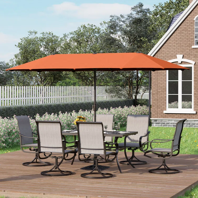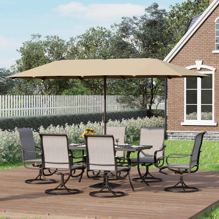Elevate your outdoor leisure with our stunning 8-piece patio dining set featuring sturdy powder-coated steel frames that guarantee durability and protection against the elements. The ensemble is complemented by vibrant swivel chairs, upholstered in quick-dry pvc-coated polyester fabric that delivers both breathability and lasting comfort under the sun. Set the scene for unforgettable moments under the expansive canopy of the included oversized umbrella, shielding you from the heat while maintaining an air of sophistication. Perfect for hosting intimate gatherings or simply relishing a relaxing afternoon, this dynamic 8-piece set merges contemporary design with practicality.