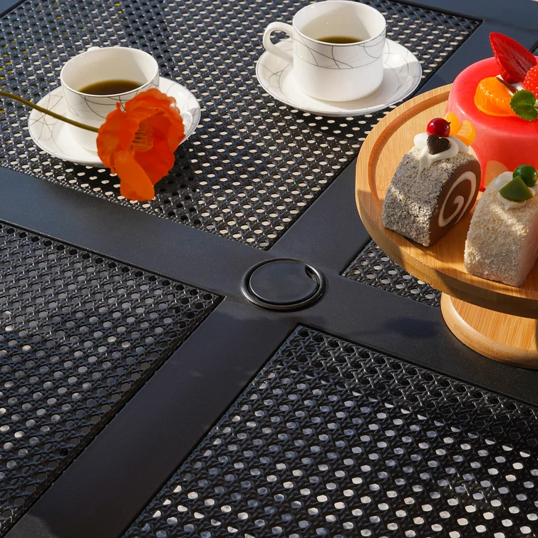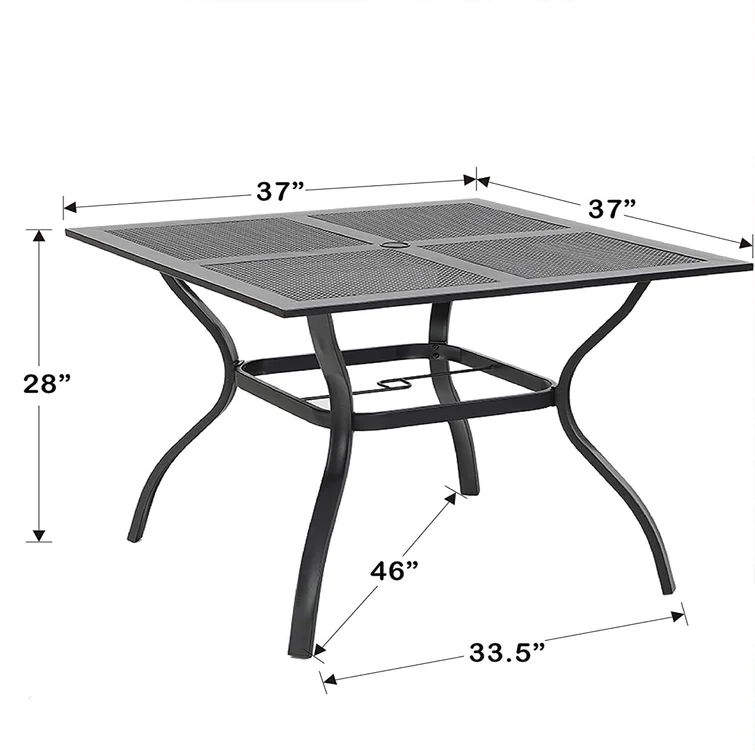 The rectangular 4-person 37' long dining set with cushions symbolizes harmony and reunion, and the simple metal plate tabletop has artistic beauty. The 5 pieces patio dining set includes one square dining table and 4 chairs with cushions. 1.57' umbrella hole design allows you to enjoy a comfortable outdoor dining time no matter it is sunny or rainy.