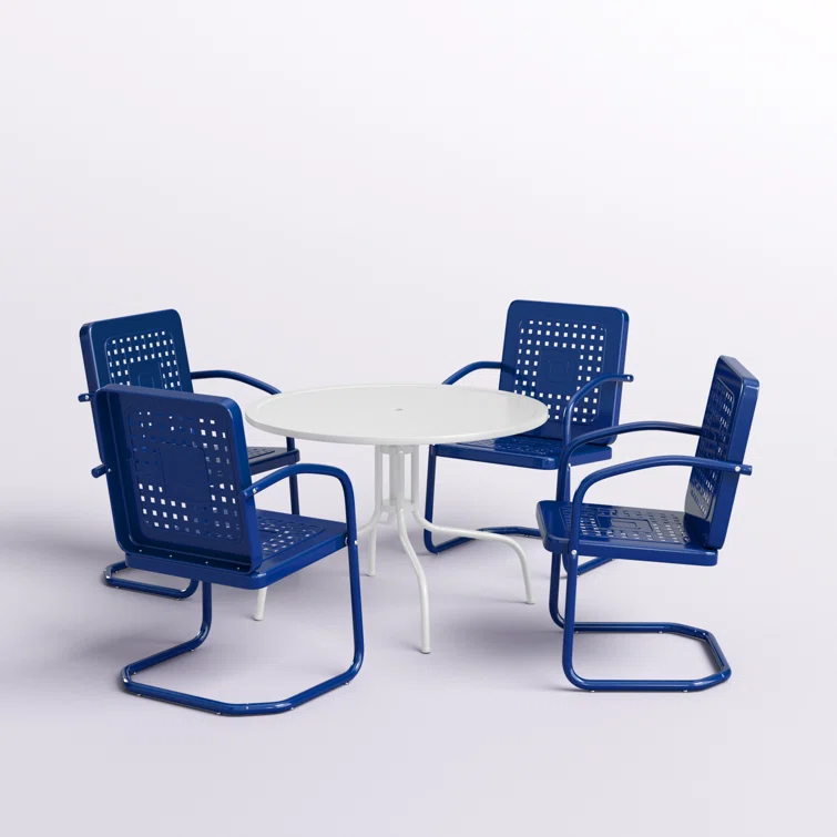 This 5-piece outdoor seating group gives you a spot on your patio or porch to enjoy lemonade and fun chats with friends. It includes a round table and four accompanying chairs, all items crafted from metal. The chairs are vintage-inspired and come in a vivid blue. Plus, they feature basketweave openwork on the seat and back for extra breathability, and the arms and legs connect to form a cantilever design. The table has a contrasting white satin finish and a simple pedestal base to round out the look.