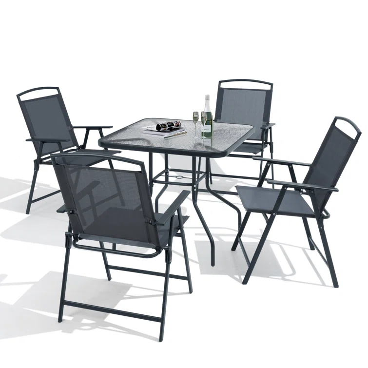 This 5 pcs patio dining set will be perfect for your outdoor, and indoor life. Made of solid steel frame with durable, weather-resistant fabric for years of use. The quick-dry fabric is completely weatherproof with UV protection. Matched a coffee table that has a tempered glass top for you to put snacks, drinks, brunch, and magazines on it. Assembly is not required for all chairs and easy assembly for the table with all necessary hardware, tools, and manual. The patio furniture is the best choice for you to enjoy yourself with your friends or families in your garden, poolside, backyard, or balcony.