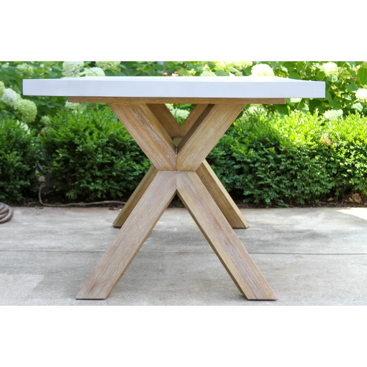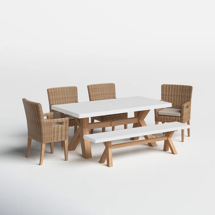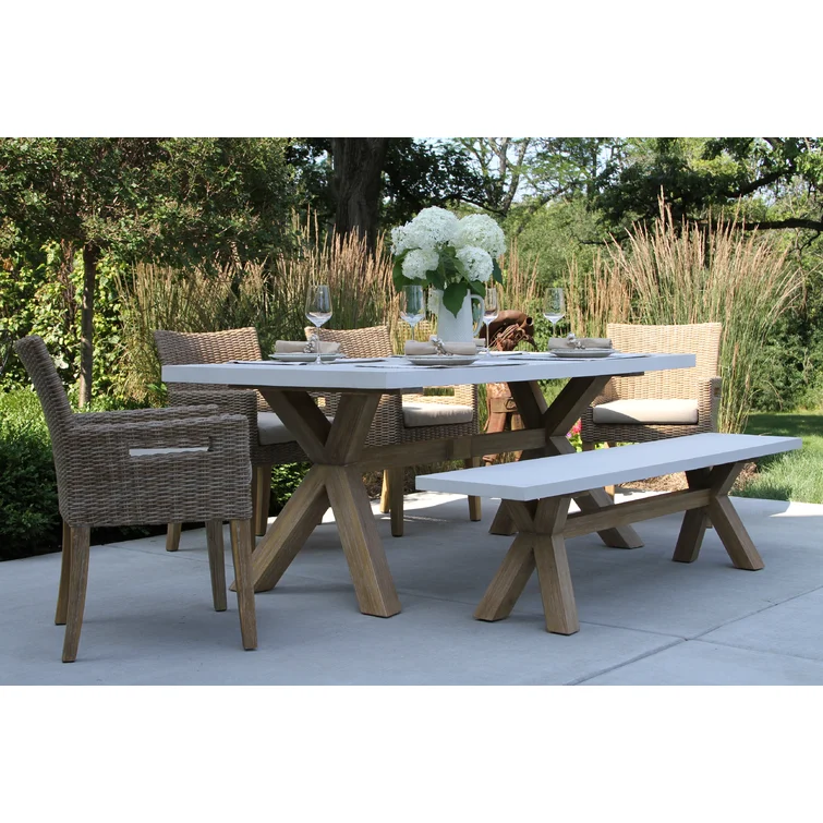 This dining set is made from sustainable, plantation-grown eucalyptus, wheat-toned HDPE all-weather wicker, and a molded polyresin and blended with powdered concrete for texture, density, and long-lasting durability in all climates. The composite's unique final finish, which appears like freshly poured white and ivory concrete, is durable and resistant to many tough stains for years of use and enjoyment. The eucalyptus bases and legs are gently brushed for texture and then stained and washed in a beautiful UV inhibited lasting finish. The cushions are made with Olefin fabrics. The quality weather-resistant Olefin fabric cushions are mildew resistant, quick-drying, and provide water repellency. The chair arms are also designed with convenient open handles.