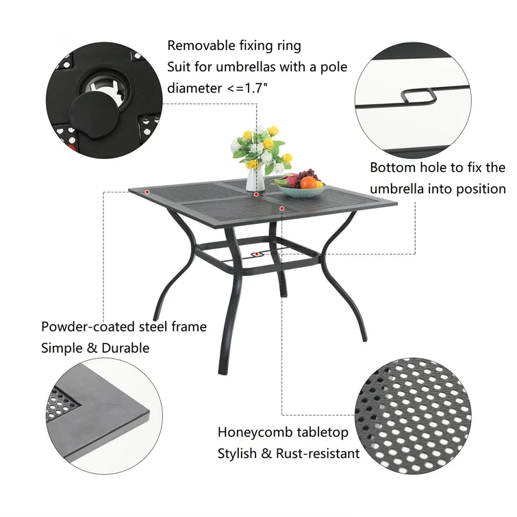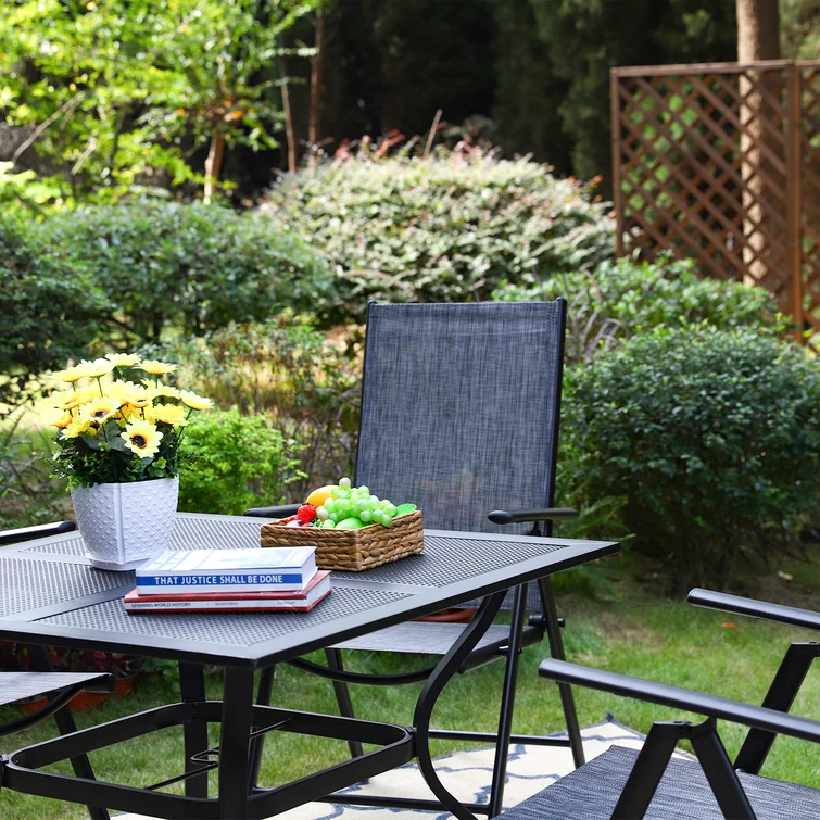 Crafted from high-quality powder-coated metal alloy, the set includes one square table with a mesh-style tabletop and four folding chairs with breathable sling fabric. Good looks matched by strong durability make our outdoor set an elegant, but the functional choice for your patio lawn and garden, etc.