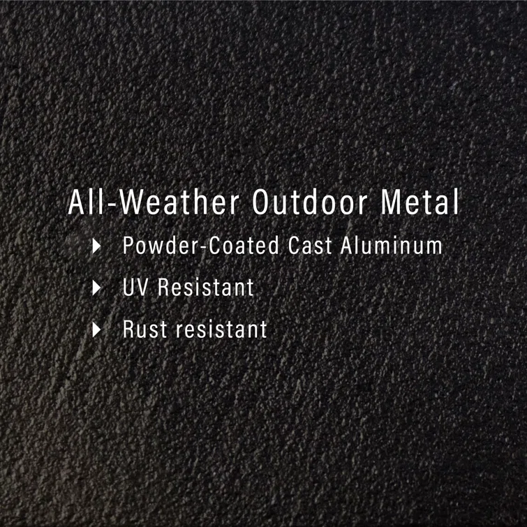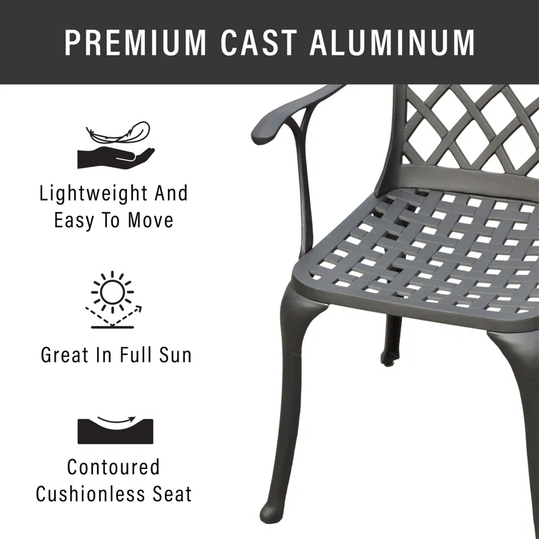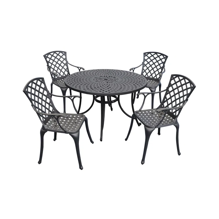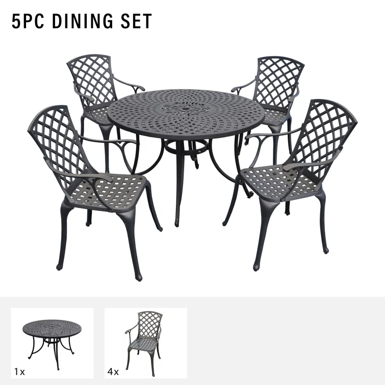 Create a space to relax beside friends and family with this Algrid round 4 - person dining set. It's made from weather-resistant aluminum with a matte black finish. The four chairs feature open armrests and cabriole-inspired legs for a traditional silhouette. The seats and backs display an open-work woven design that prevents water from pooling and creates an airy aesthetic. This set's table has legs and a round tabletop with an eye-catching design. Plus, the table has an umbrella hole to help keep you and your guest out of the sun and rain.