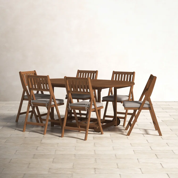 This 7-piece outdoor furniture set is a must in any home, especially if you love entertaining out on the back patio or porch. It comes with one dining table and six dining chairs, all made from solid eucalyptus wood that won't mind UV light beaming down or rainstorms rolling through. Plus, the six chairs come with fabric cushions, and they can all fold up, so storage in the off-season is a breeze. Their slatted designs add lots of character while allowing rainwater to trickle through, which we know you'll appreciate.