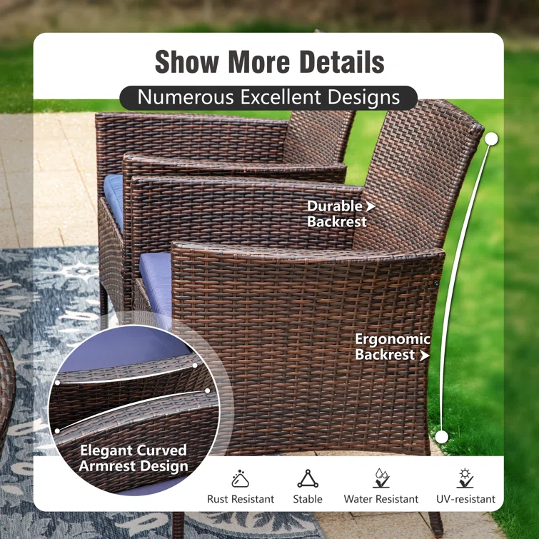 - 6 patio pe-rattan chairs: The inclined backrest of a certain radian with moderate armrest height for extra comfort and relaxation. Spacious seat featuring a soft cushion with a padded sponge which can help you relieve fatigue.