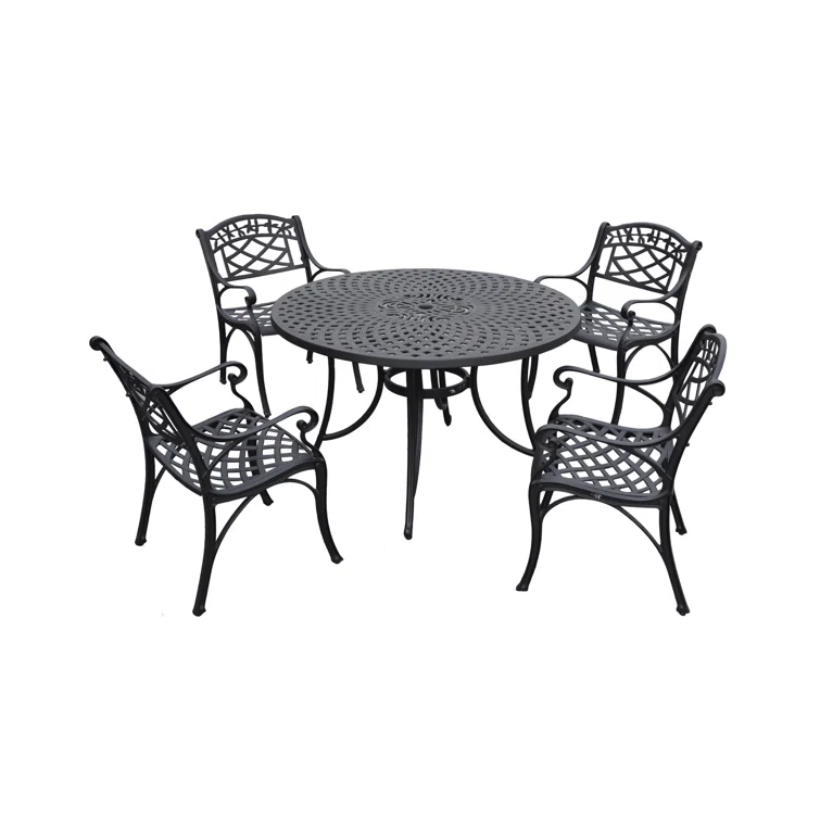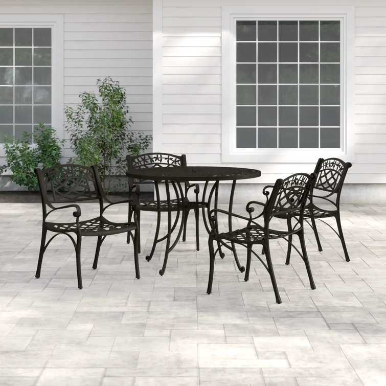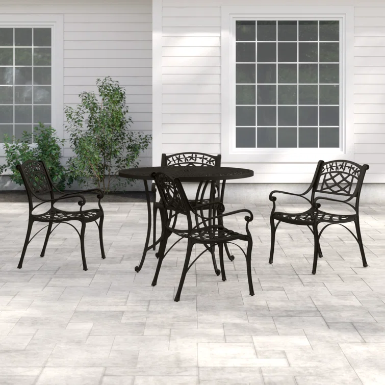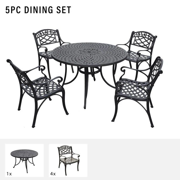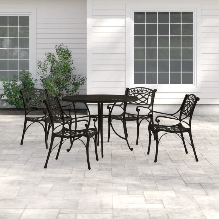 Kick back with coffee, cocktails, and company with this five-piece patio dining set, complete with one circular table and four matching armchairs. Crafted from aluminum, each versatile design sports a powder-coated black finish that resists weather, water, and UV. Geometric openwork along the seats, backs, and tabletop offers up a dash of classic character, while also letting the rain run right through so water won’t pool. Assembly is required.