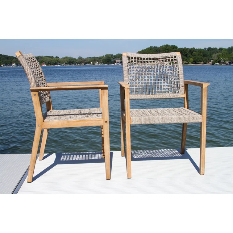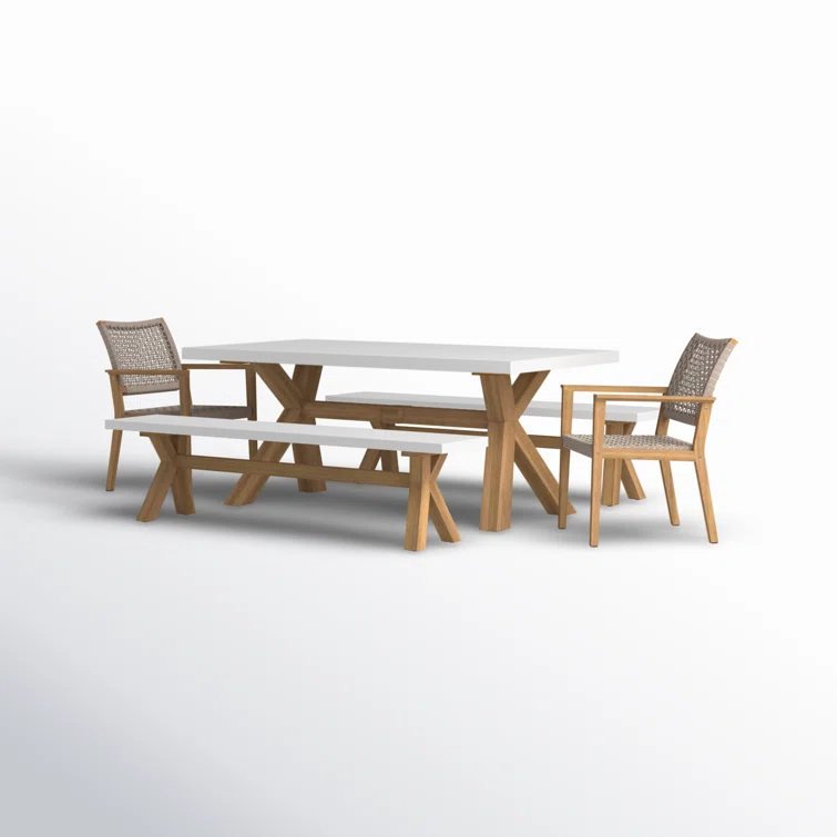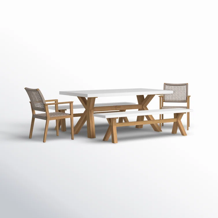 Gather your friends and family for an al fresco meal on your porch or patio with this 5-piece outdoor dining set. It includes two armchairs, two benches, and a table, all crafted from solid eucalyptus wood with a UV-resistant, light brown finish that stands up to the elements. The thick composite table and bench tops are crafted from molded polyresin and powdered concrete for a weather-resistant surface, and they rest on X-shaped legs. Each chair showcases nautical-grade rope seats for a stylish and textured look. Plus, the table has an umbrella hole and a matching composite plug. To maintain this set's appearance, apply teak, linseed, or other hardwood oil 1-2 times per year and cover during harsh months.