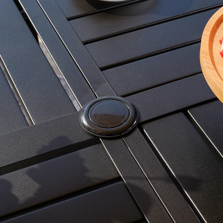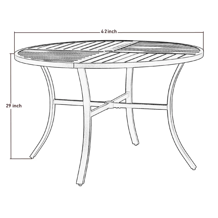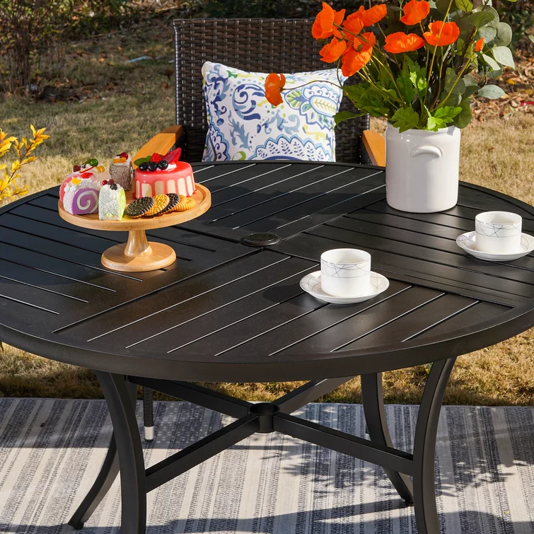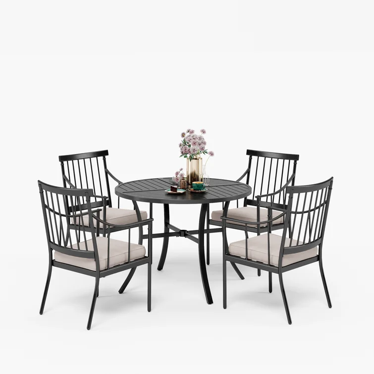The elegant round dining table symbolizes harmony and reunion, and the simple metal plate tabletop has artistic beauty. The 5 pieces patio dining set includes one big round dining table and 4 chairs with cushions. 1.9' umbrella hole design allows you to enjoy a comfortable outdoor dining time no matter it is sunny or rainy.
