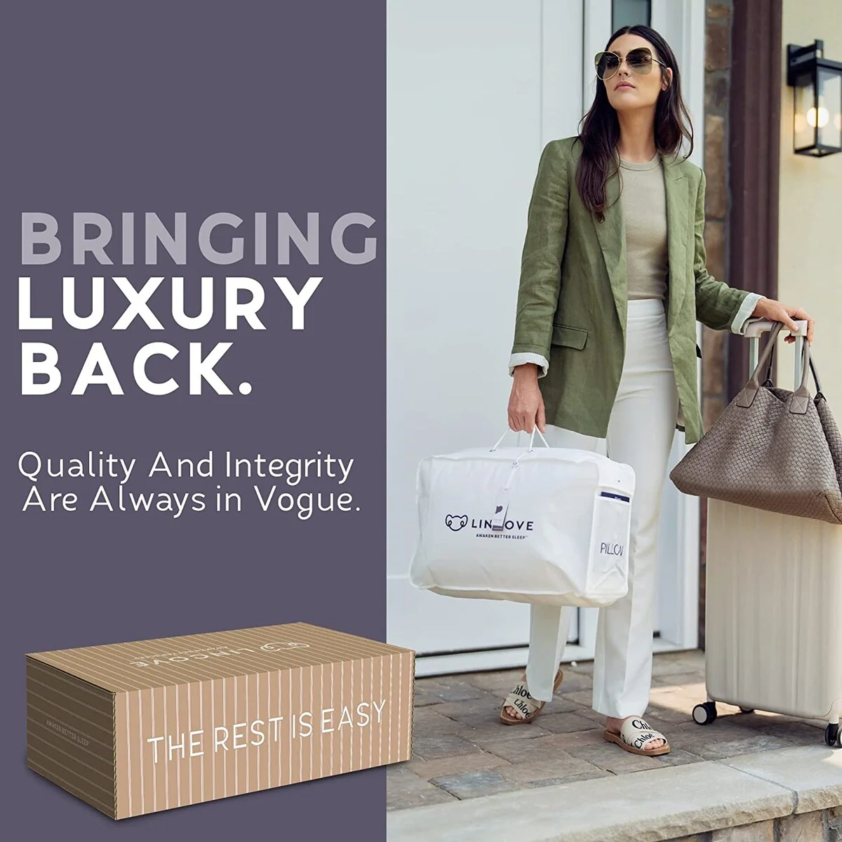 Luxury Delivered at Your Doorstep. Fluffed prior to shipping and packaged in its own custom travel tote. We designed our packaging to cradle our perfectly pre-fluffed pillows, which means no vacuum seals, no sad, flattened pillow bricks that need rejuvenating, and no kinks to smooth.