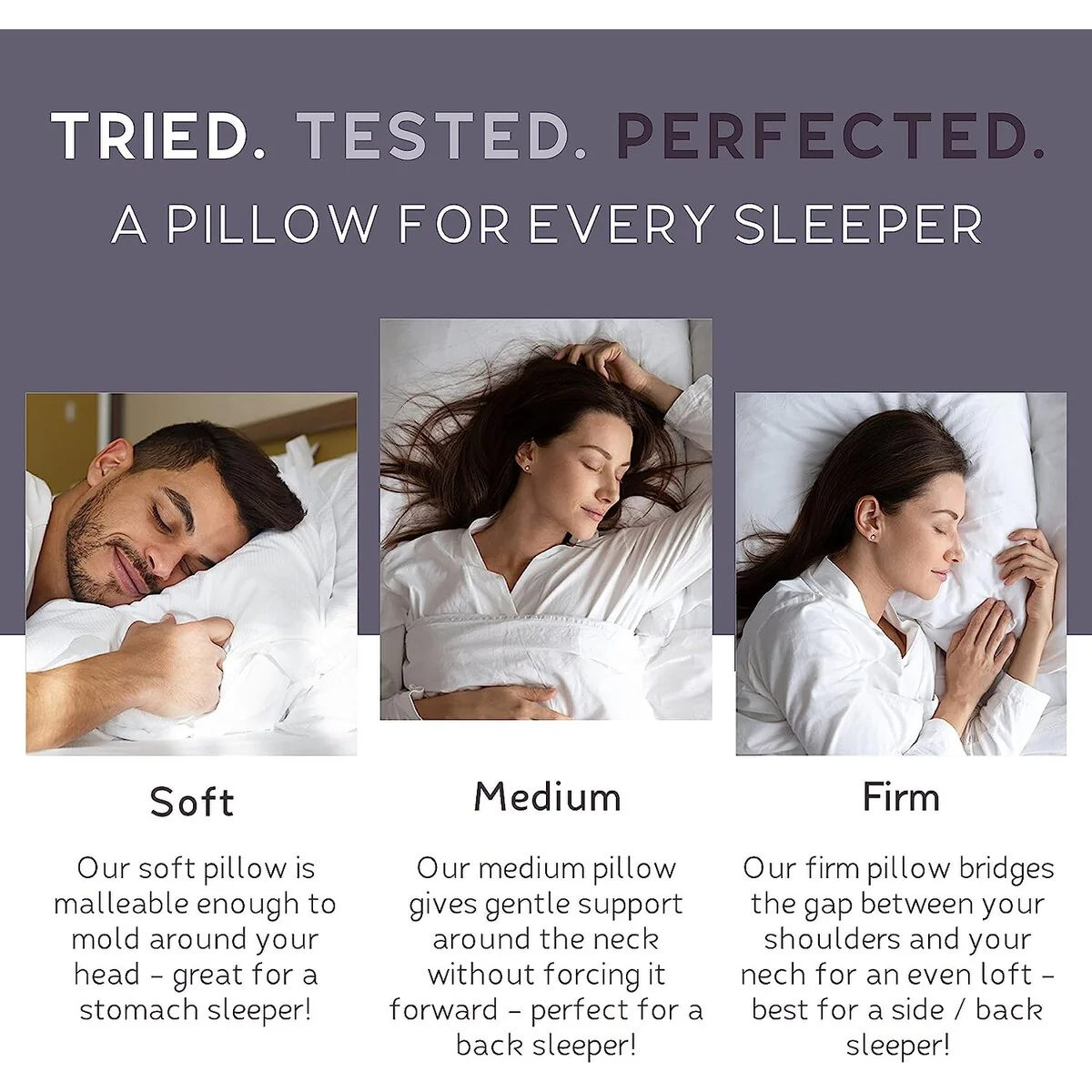 The liner is double stitched at the edges to ensure years of supreme durability, with a dense fabric weave that gives the pillow a luxurious finish and bright white, fresh appearance. Expertly tailored to ensure maximum comfort for any and all sleeping positions. Enjoy a pillow that will remain fluffy for years to come.