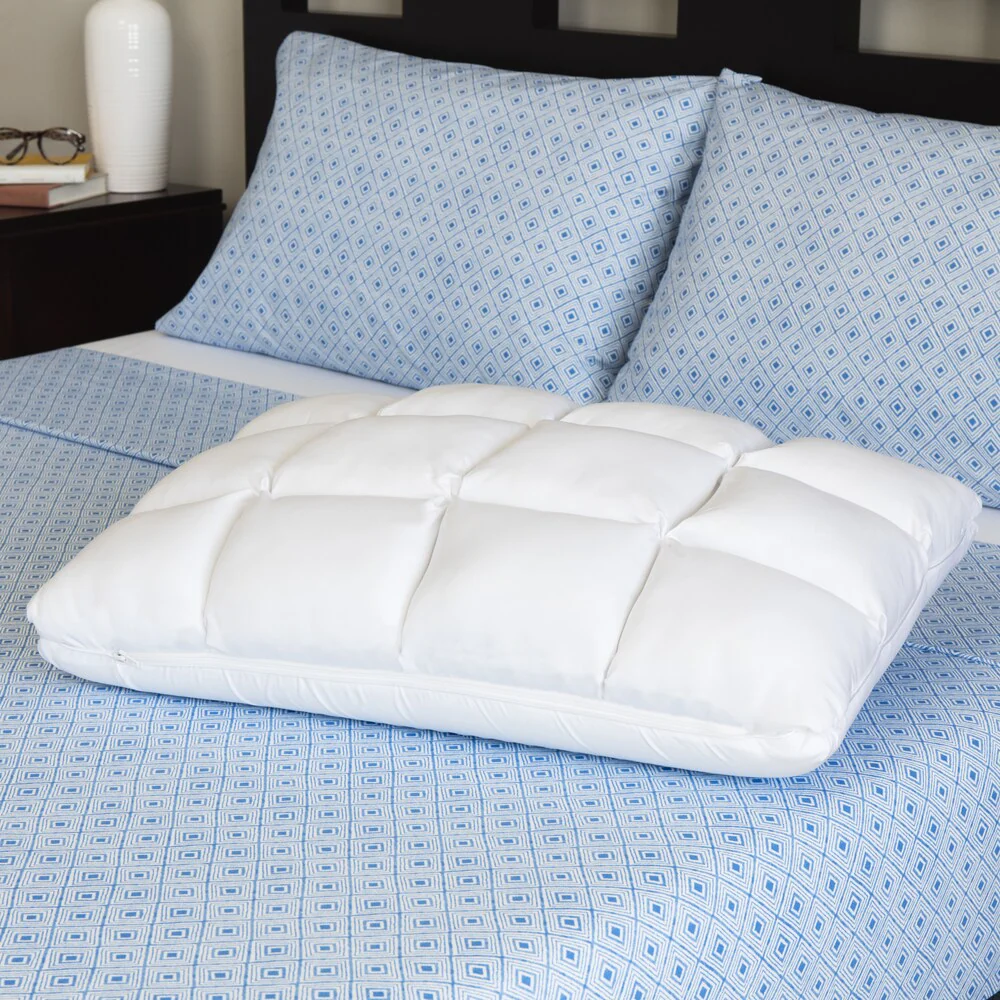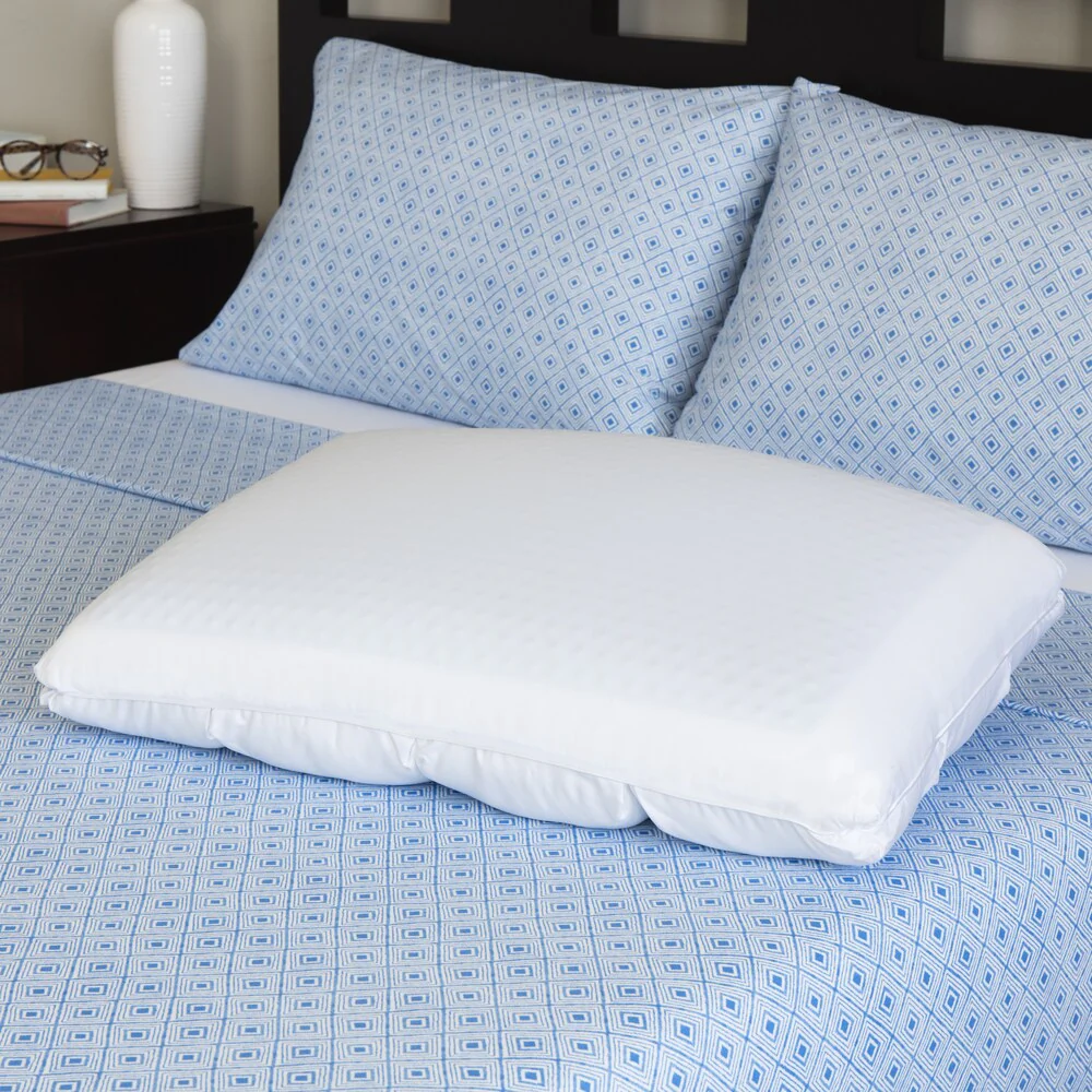 Enjoy the benefits of both a traditional pillow and a memory foam pillow with PureCare's SoftCell hybrid bed pillow. This unique pillow features a top layer with 12 individual pockets of soft poly fibers on one side, a somewhat firmer reverse side with a memory foam insert, and another small removable poly pouch. If you want to adjust the firmness of this pillow, simply flip it over or remove a layer or two for a whole new experience. This pillow's machine washable cover is made of a cutting-edge blend of cooling FRIO fibers and Tencel for a uniquely soft and absorbent fabric that resists getting too hot.