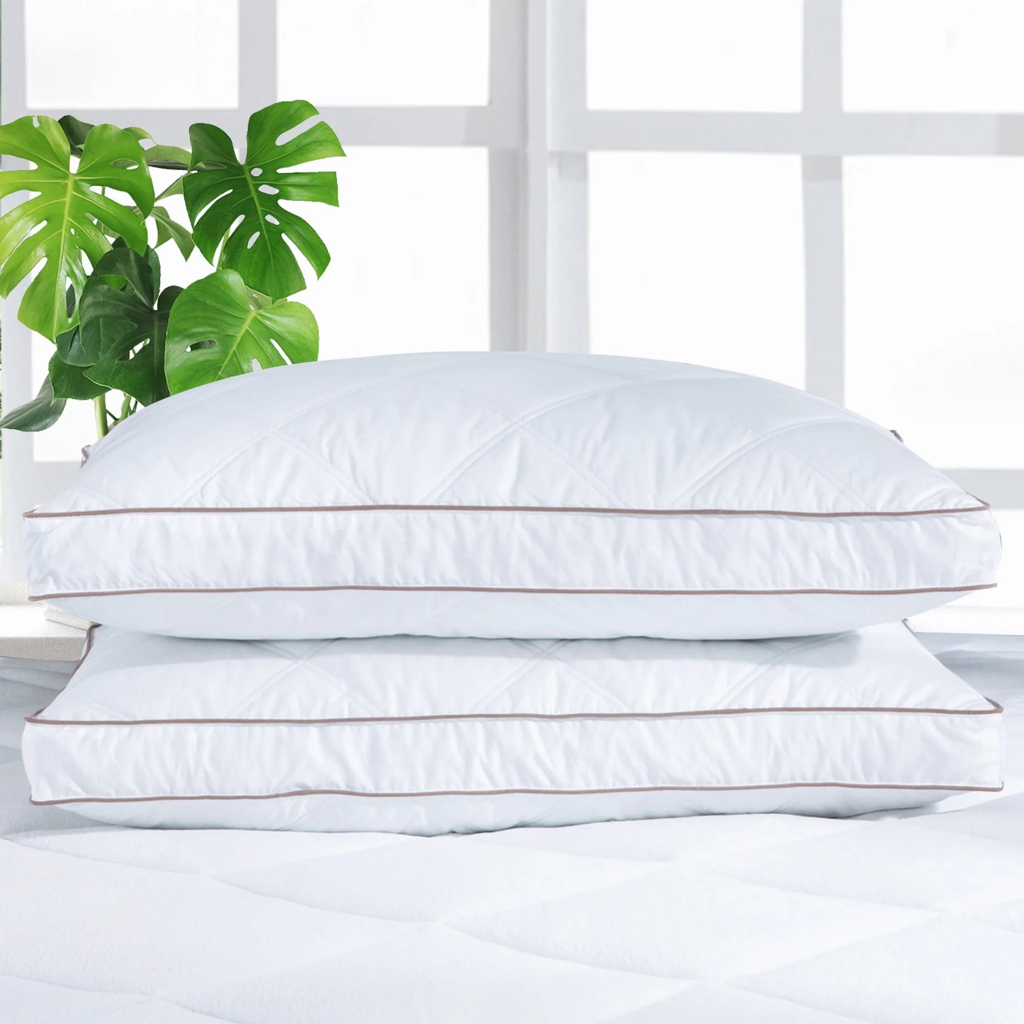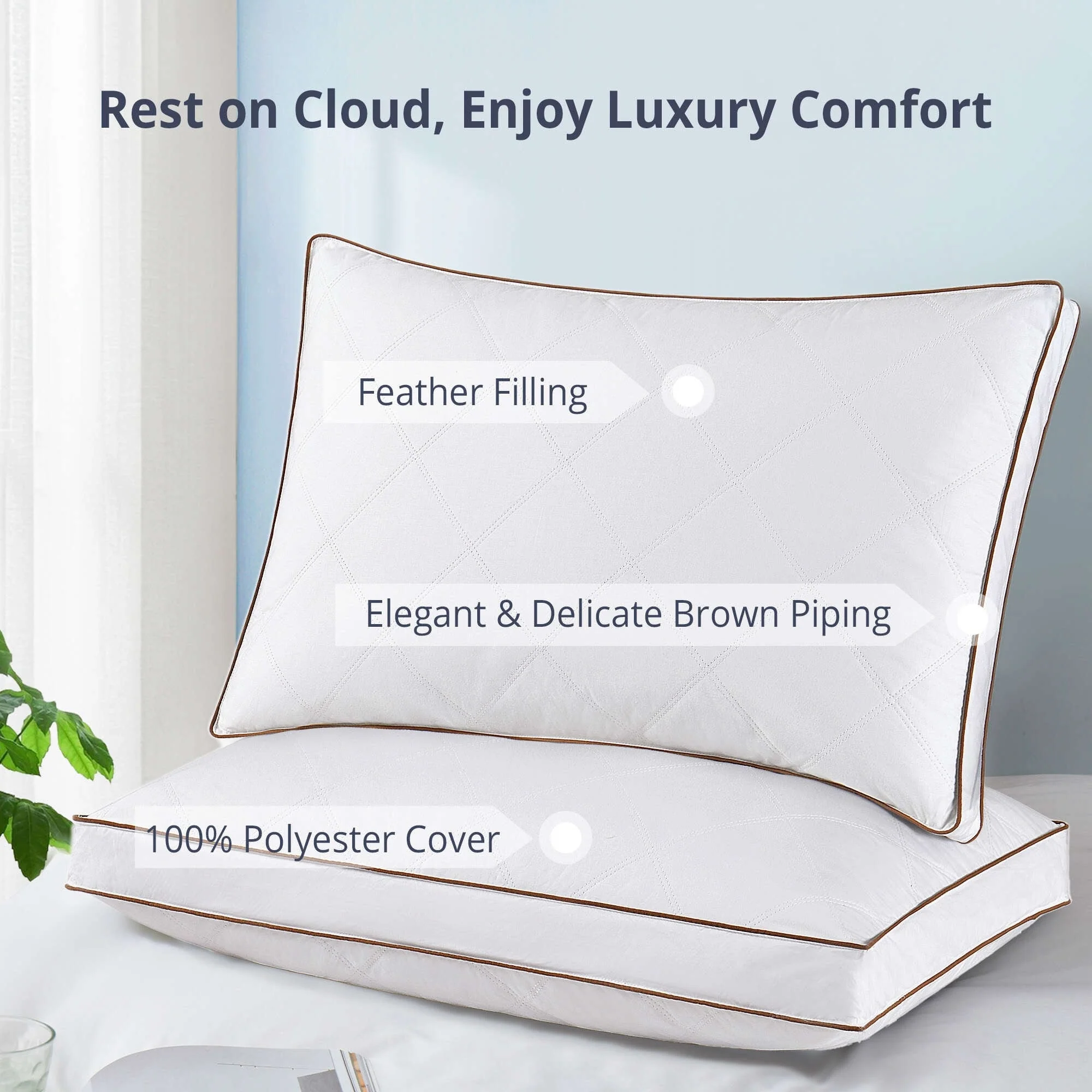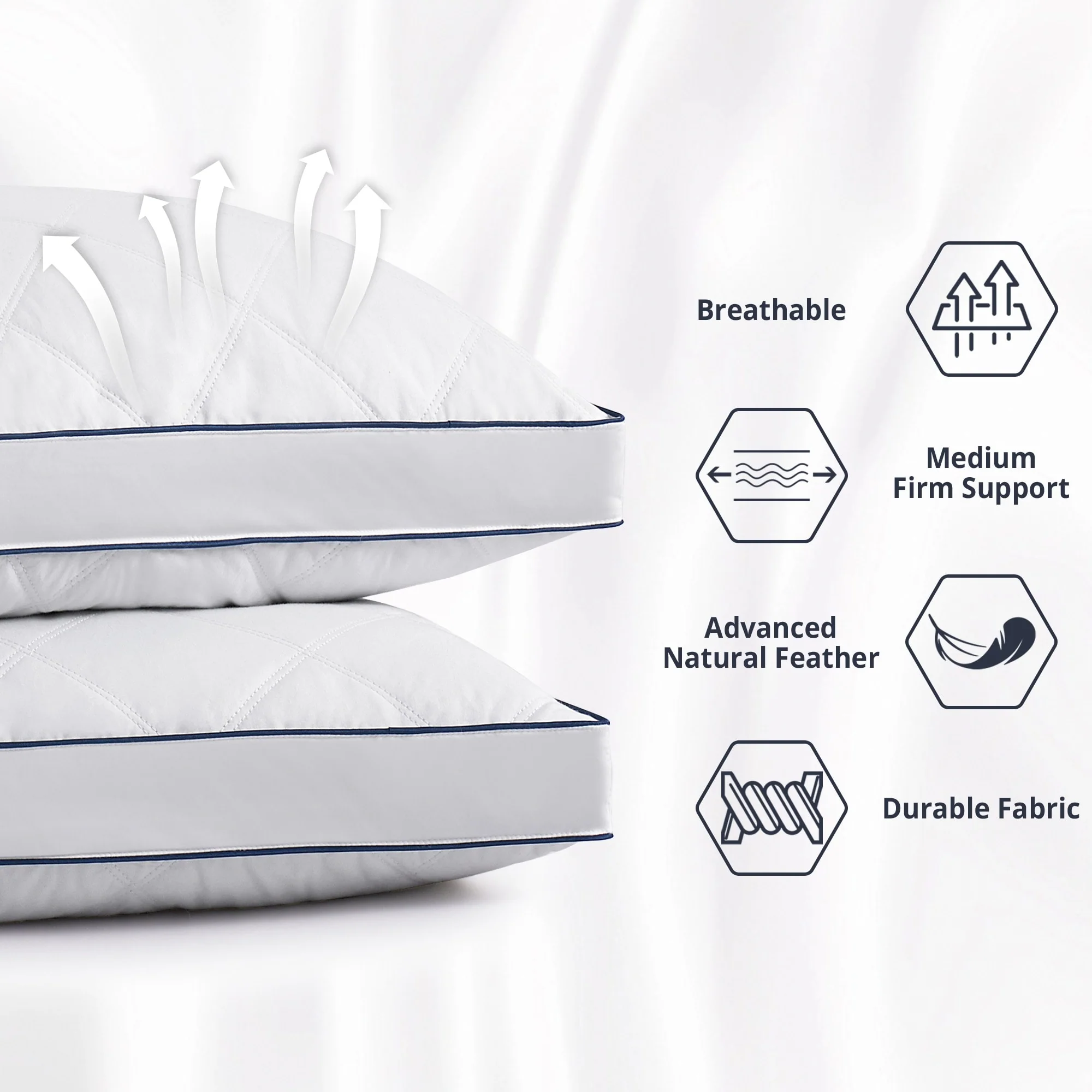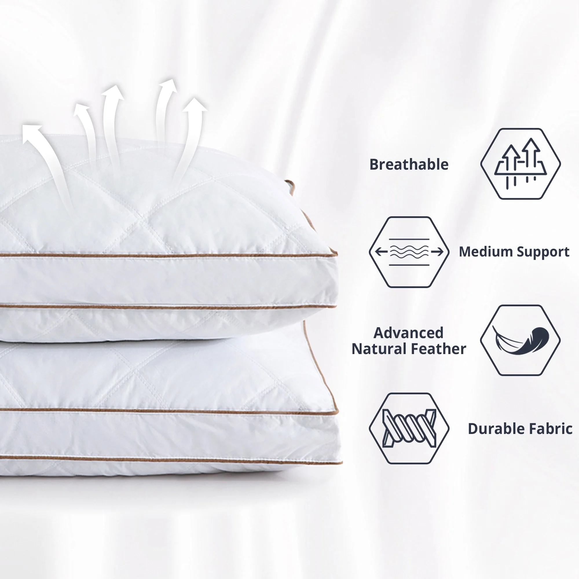 Experience ultimate comfort with our premium pillow, designed for a restful night's sleep. This pillow features a luxurious blend of 95% goose feathers and 5% goose down, providing the perfect balance of support and softness. Its 2-inch gusseted edge enhances durability and maintains its shape over time. Available in three sizes to suit your needs: Standard (20' x 26'), Queen (20' x 28'), and King (20' x 34'). Machine washable for easy care, this pillow combines practicality and luxury, making it an excellent addition to any bedroom. Indulge in the perfect blend of comfort and support every night.