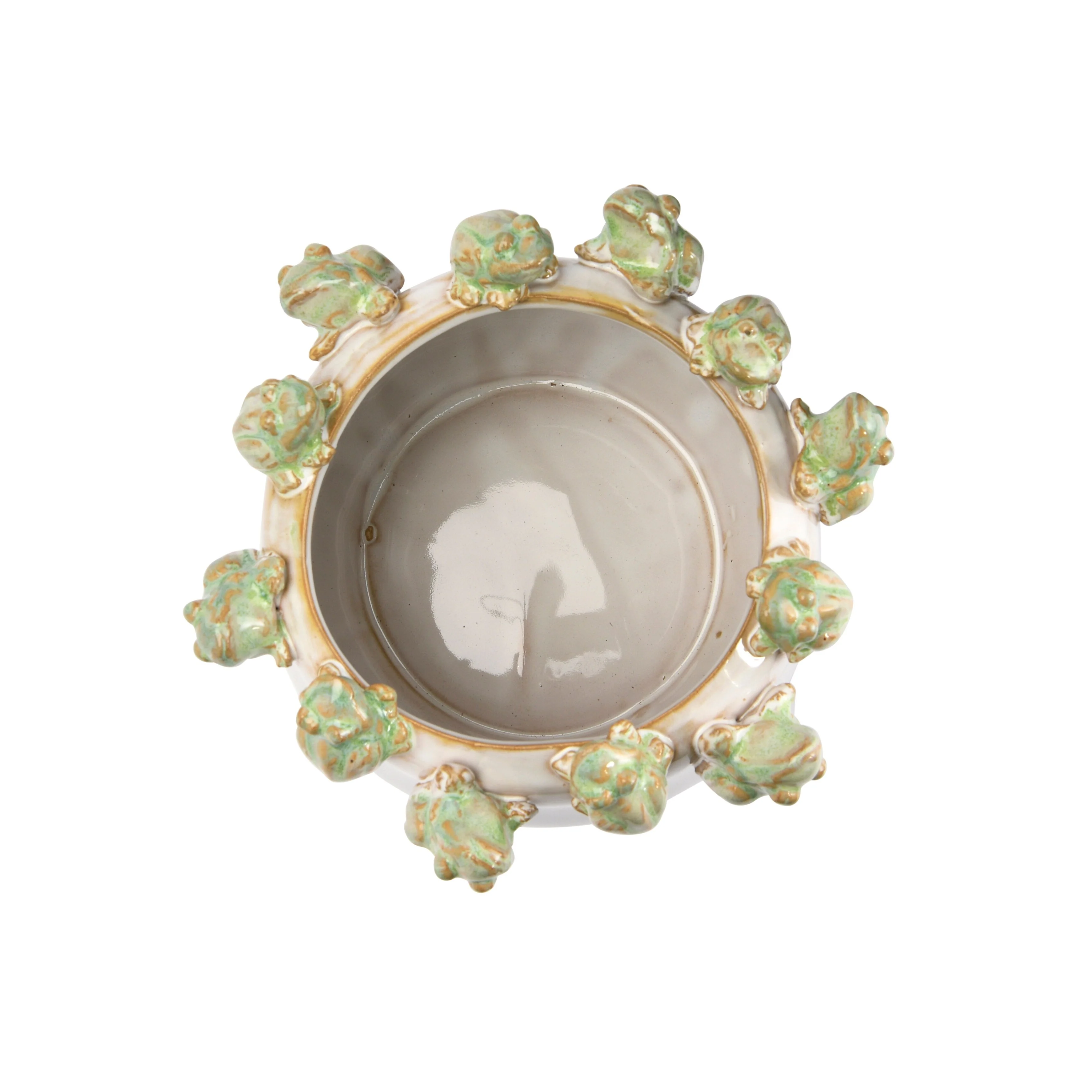 - A cute stoneware planter with two birds perched on the rim and a multi color reactive glaze finish