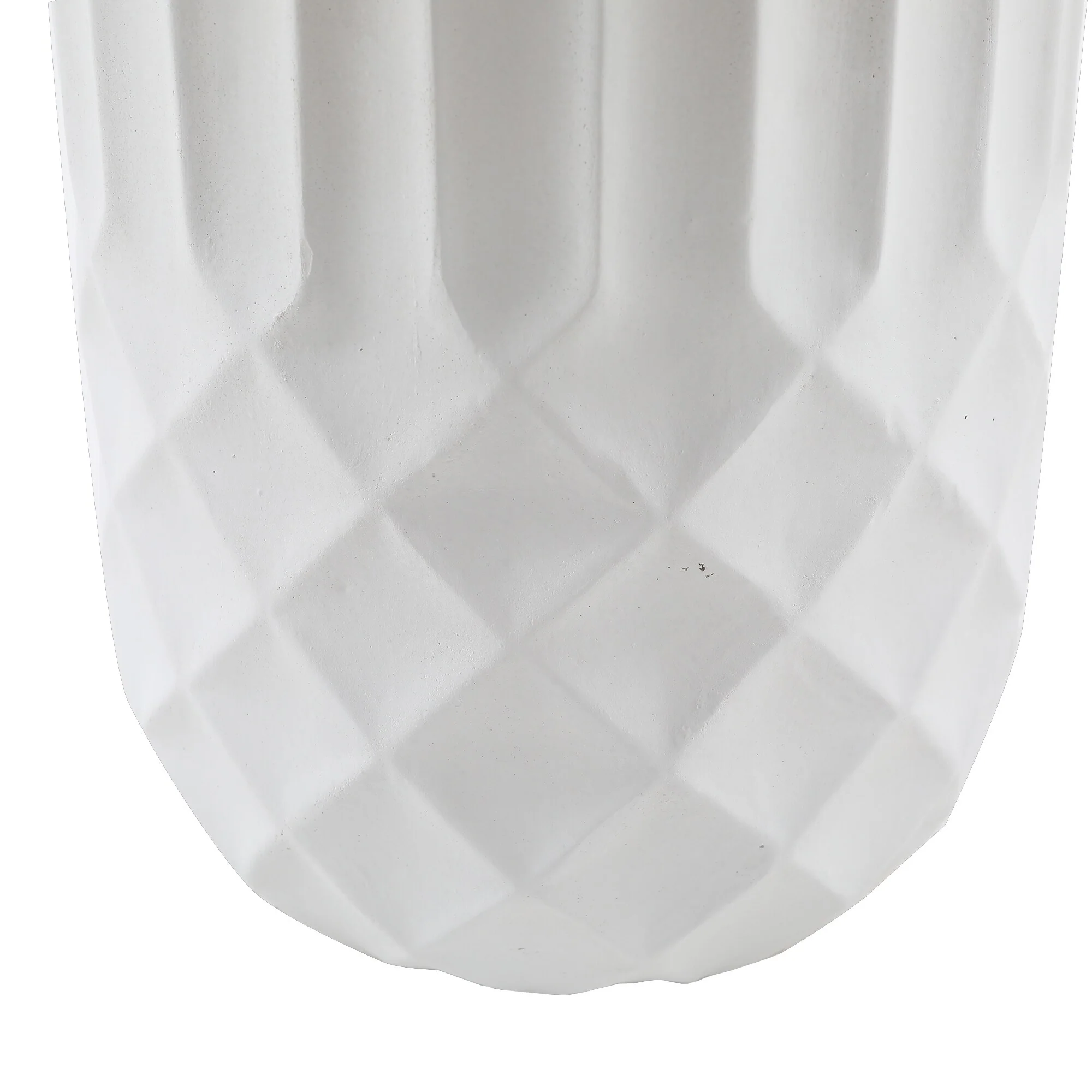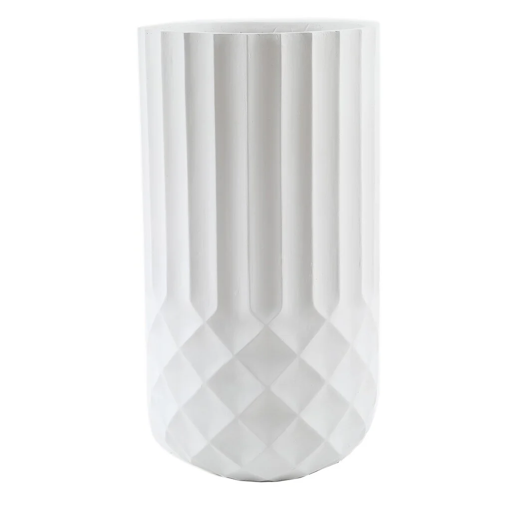 Add a stylish touch to your home or garden with this White MgO Tall Round Planter. The contemporary design features a two-pattern dimension that adds depth and uniqueness to the planter. The raised vertical lines at the top make the planter look taller, while the diamond pattern at the base is visually appealing. Made from magnesium oxide, this planter is durable and suitable for outdoor use. It includes a drainage hole and plug to prevent over-watering of plants. Enjoy the beauty of your plants indoors or outdoors with this weather and UV resistant planter.