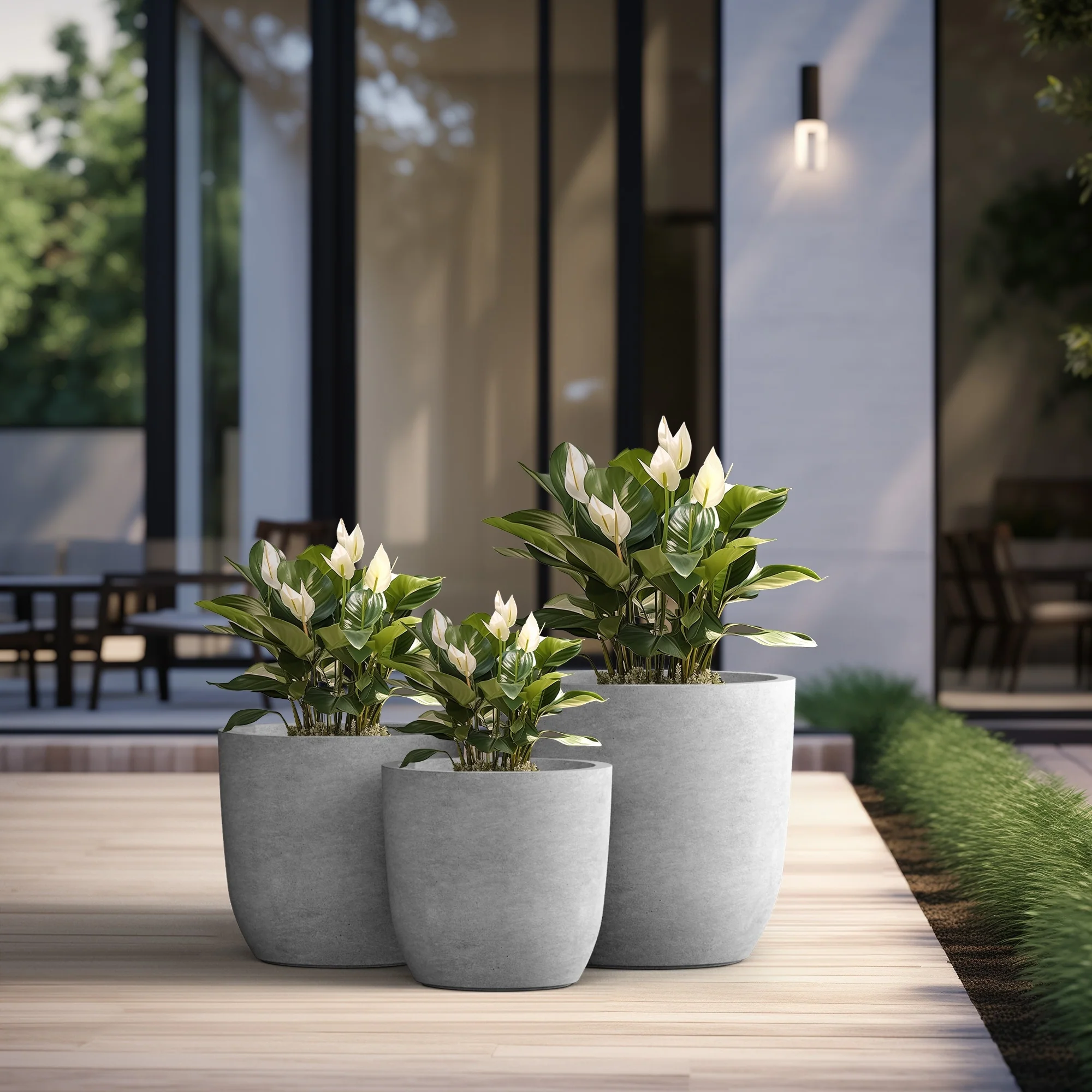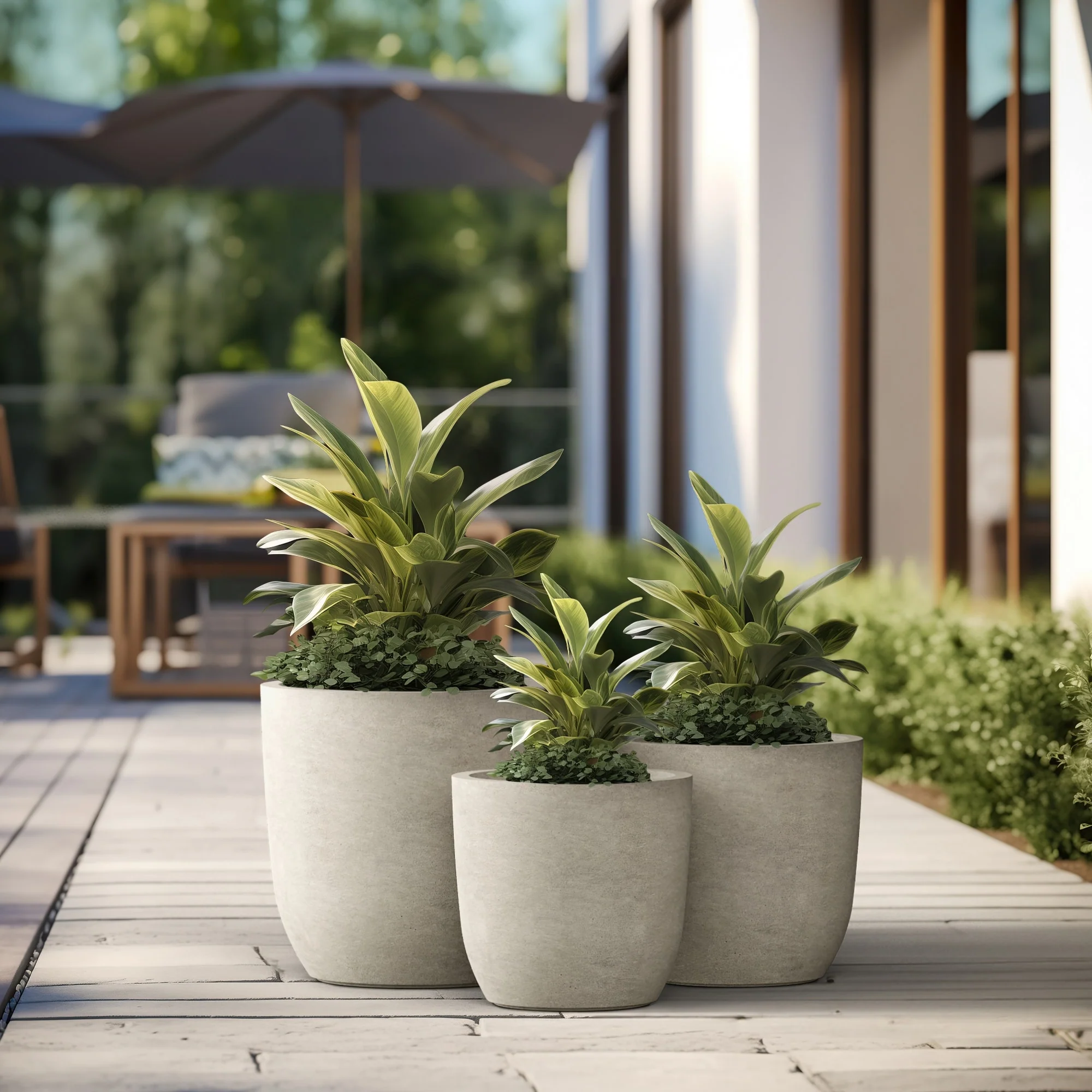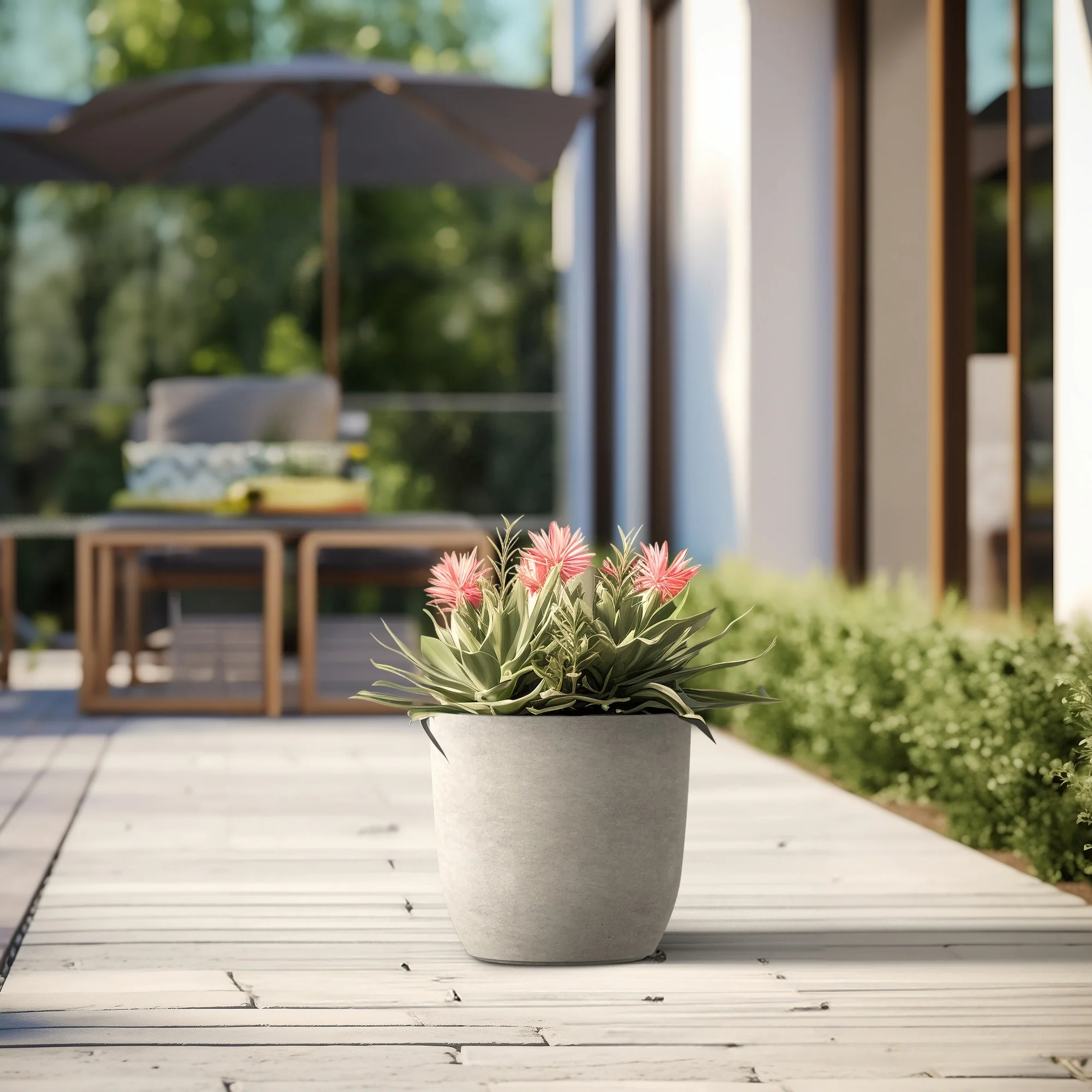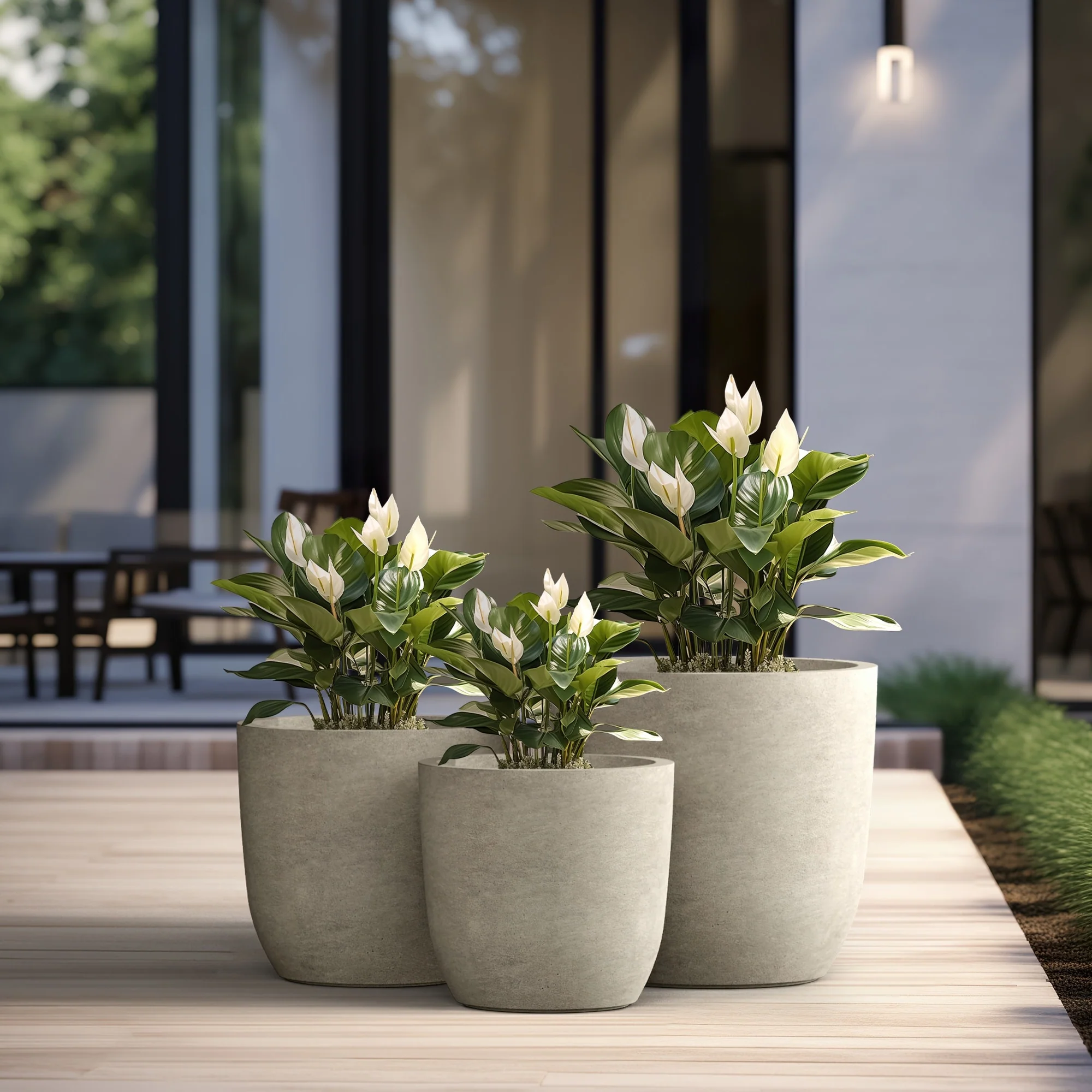 Unveil a sanctuary of green with our Durx-litecrete planters, where every piece is a blend of art and utility. These elegant planters boast a sophisticated concrete finish with visible pores, a testament to their authentic, contemporary design. Their weight is a pleasant surprise, substantial in appearance yet light enough to grace both indoor and outdoor settings. The smooth texture stands in stark contrast to the traditional rough concrete, making these planters a perfect match for the modern North American home. Spacious enough to house a diverse plant life, they sit beautifully on an apartment balcony or a vast backyard patio, infusing harmony and style with their versatile concrete finish.