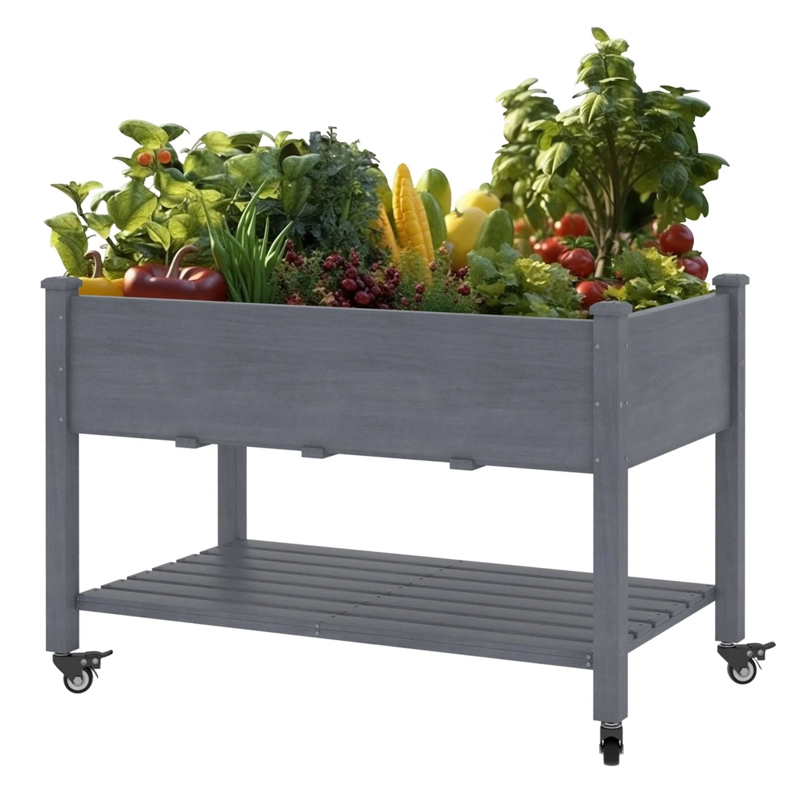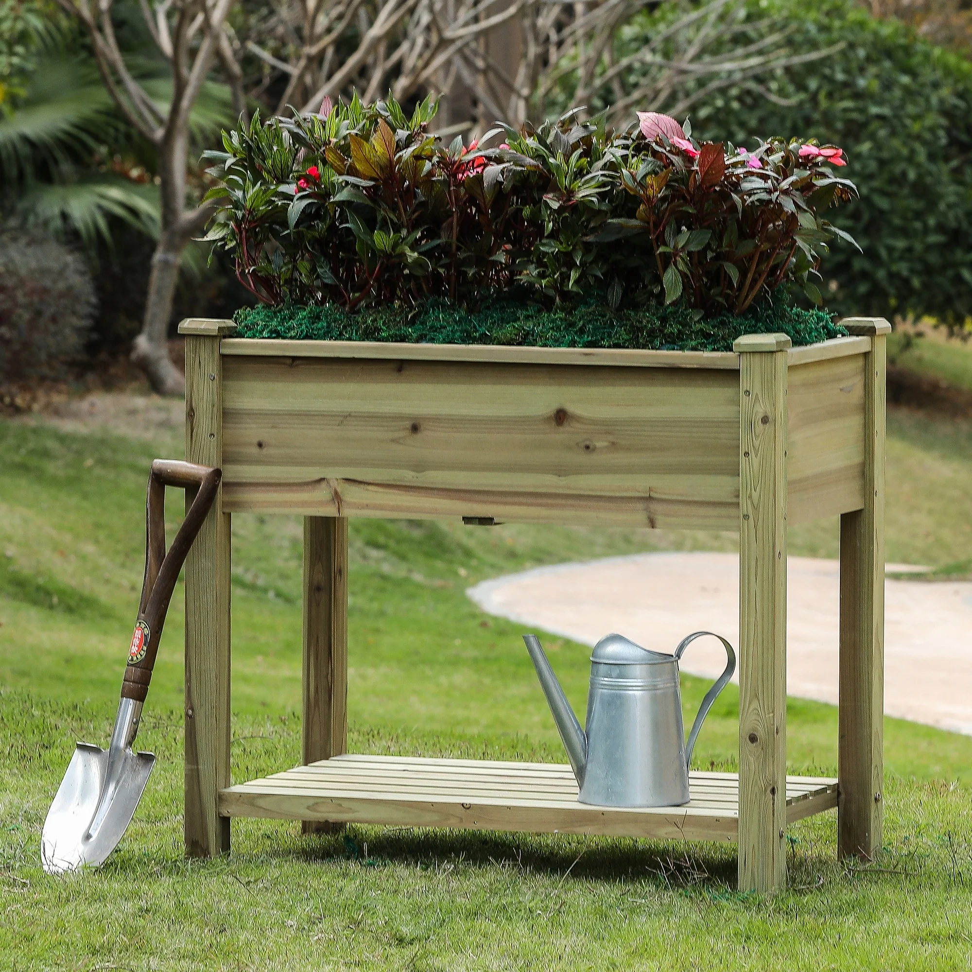 29.9 H Natural Wood Rectangular Raised Garden Planter with Shelf