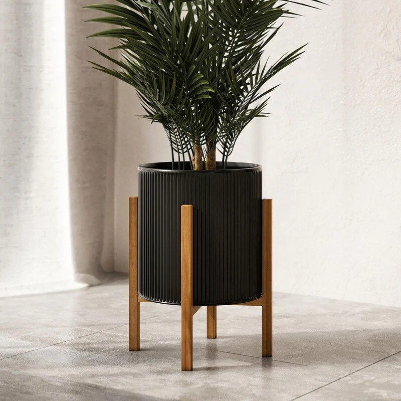 Everett Black Mid-Century Modern Indoor Metal Pot Planter with 4-Leg Wood Base