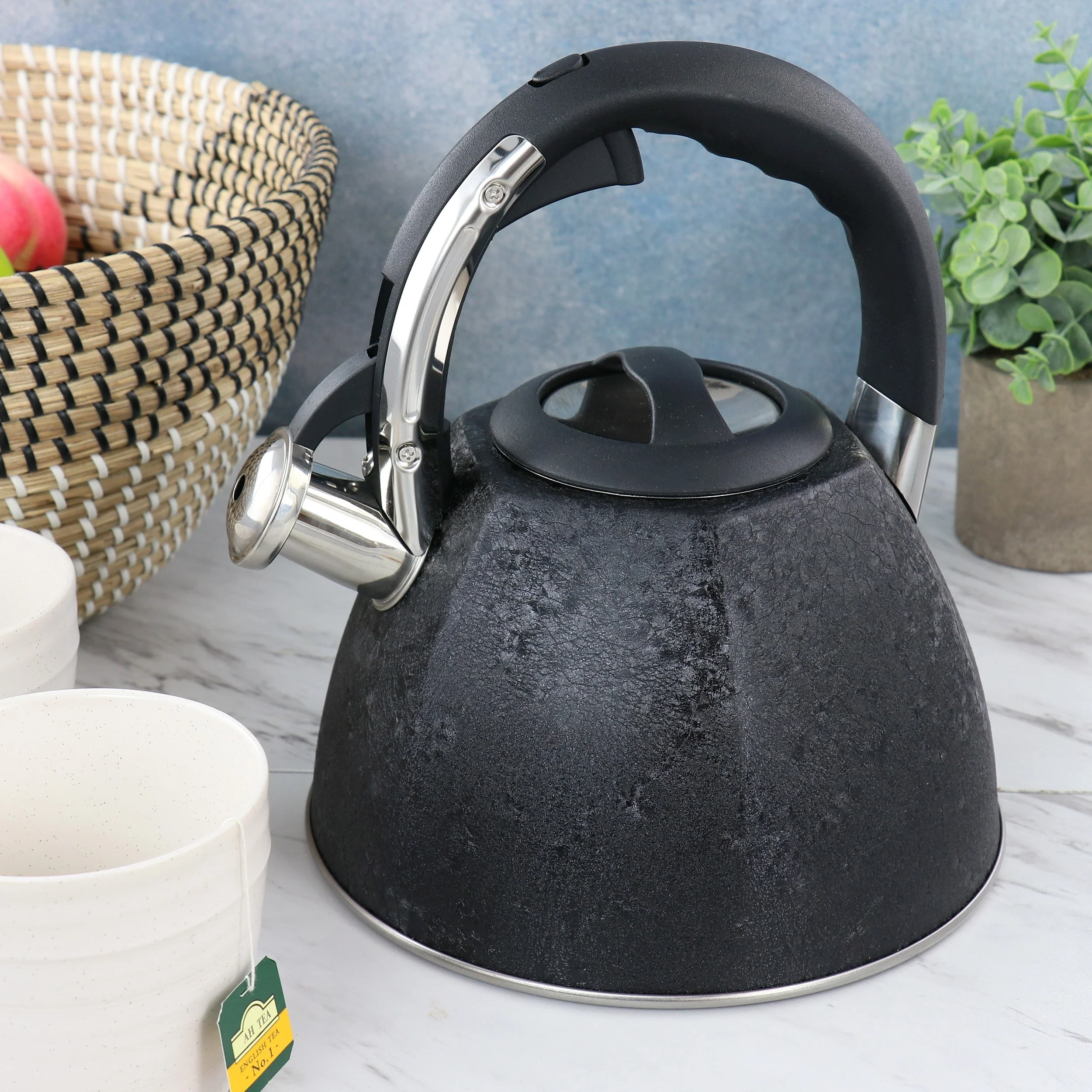 It's always time for some delicious and warm tea with this 3 Quart Stainless Steel Whistling Tea Kettle with Stay Cool Handle. Simply fill the kettle with water, place on the appropriate sized burner, and listening for a whistling to tell you that your water is ready. This kettle features a unique mechanism on the handle that will allow you to open and close the spout cover with a simple push of the button. With the stay cool handle and the spout button, this greatly reduces chance of burns. Easy one handed operation makes this kettle a great new addition to your kitchen! Item Dimensions: 10.50' x 9.50' x 8.75'