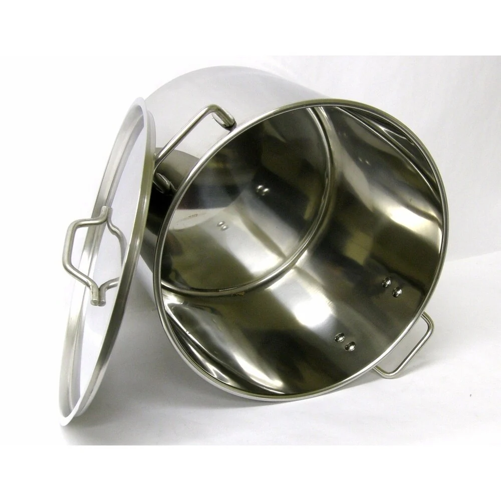 This 32QT Stainless Steel Stock Pot with Steamer Rack is your go-to solution for cooking large meals with perfection. The thick-walled body and rolled lip offer unbeatable strength while the heavy-duty handles with 4 rivets each provide a secure grip. The recessed, tight-fitting lid ensures no heat loss and even cooking. Ideal for tamales, chili, soups, boils, and canning, this pot is also perfect for steaming crabs, lobsters, seafood, and brewing beer or other distilling. With the included steamer rack standing 2.75 inches, this stockpot is incredibly versatile.