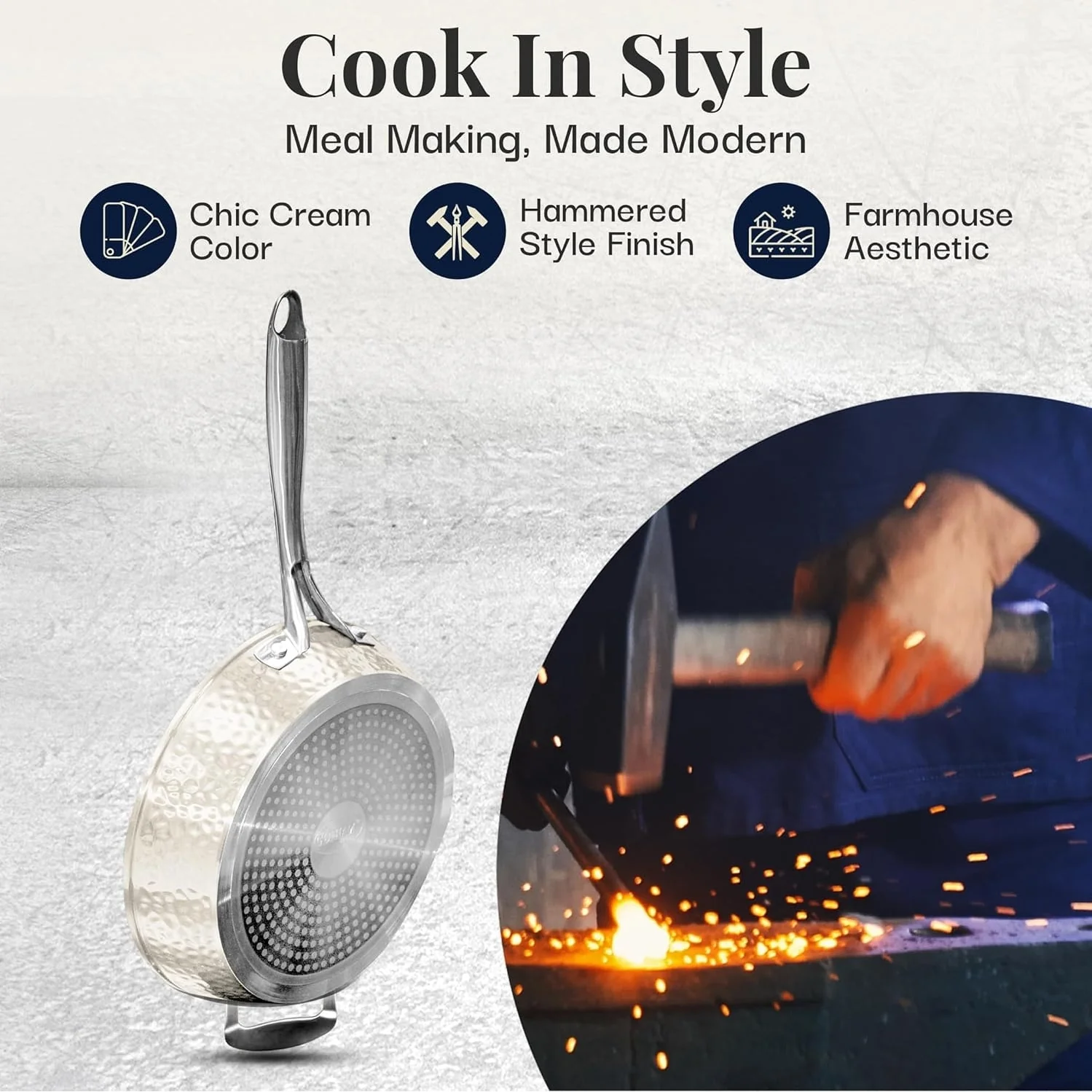Upgrade your kitchen with the Gotham Steel 14' Hammered Cream Large Frying Pan with Glass Lid, a perfect blend of style and performance. This skillet features a stunning cream-colored exterior and interior, designed to bring a touch of elegance to your kitchen. Coated with ultra-durable Ti-Cerama, which combines titanium strength with ceramic smoothness, it ensures superior nonstick capabilities, letting you cook without oil or butter for healthier meals. Free from harmful chemicals like PFOA, PFOS, PTFE, PFAS, lead, and cadmium, this frying pan is designed for safe and worry-free cooking for you and your family.