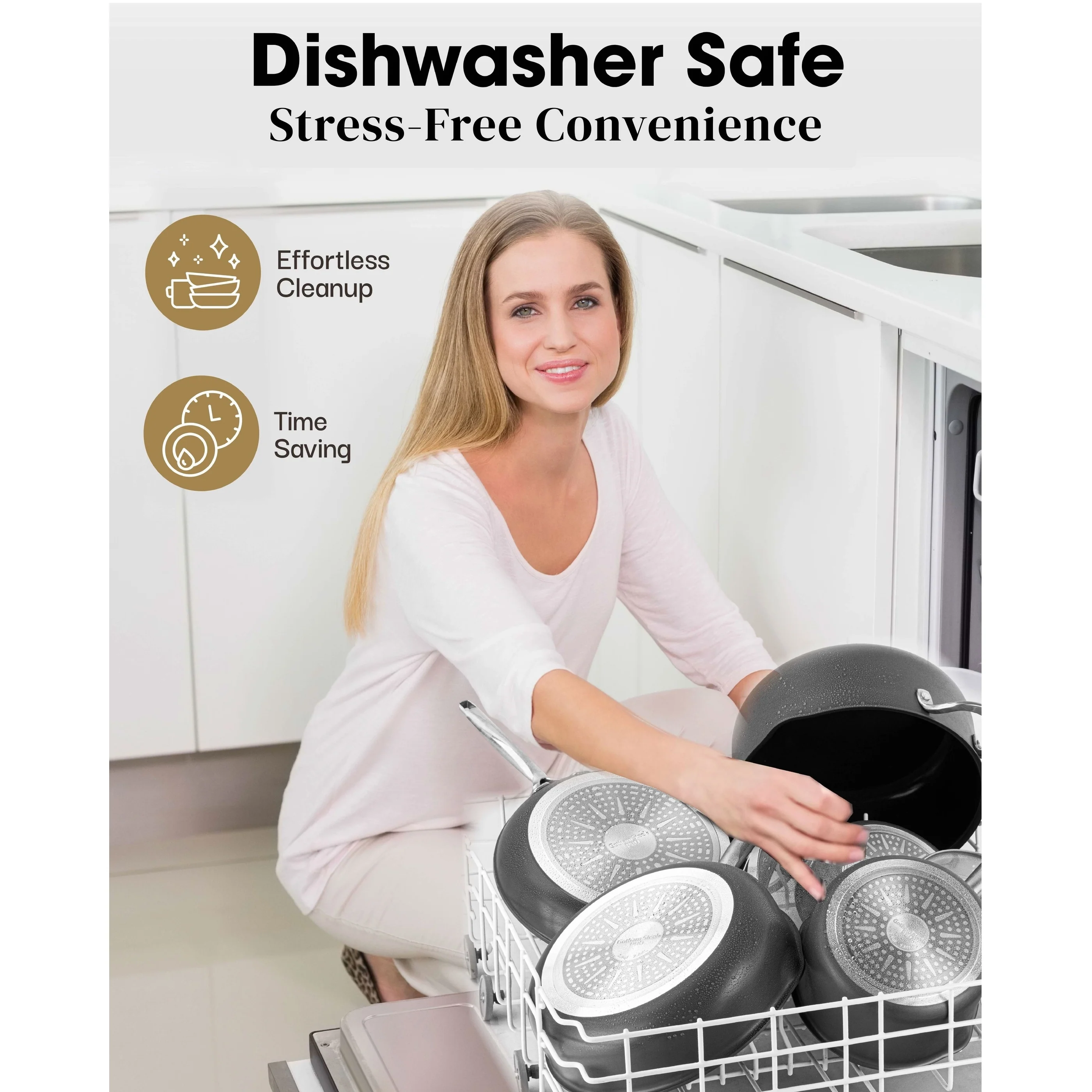 - Nontoxic and Safe to Use: Made without PFOA, PTFE, PFOS, or lead, and designed with cool-touch gold handles and dual rivets for a secure grip—safe for metal utensils and dishwasher use.