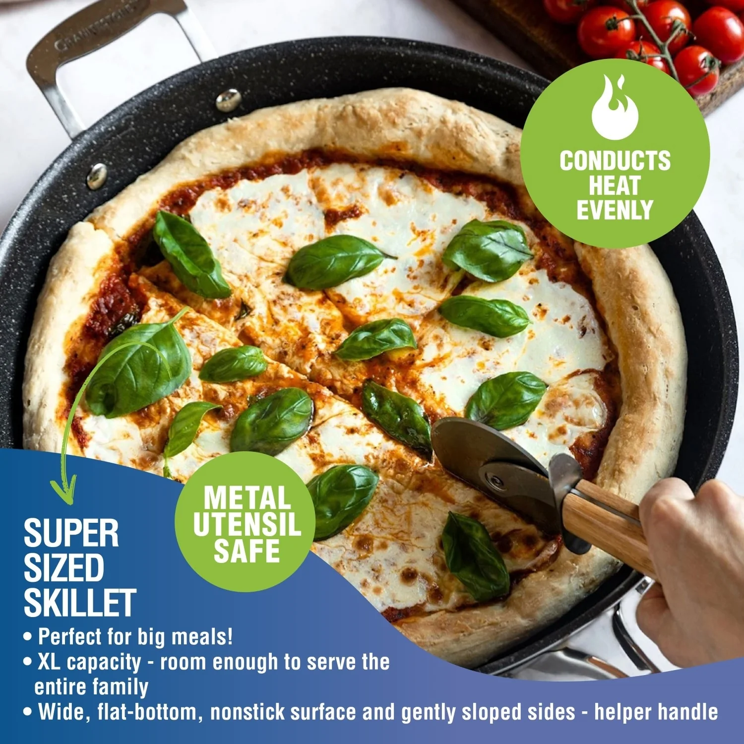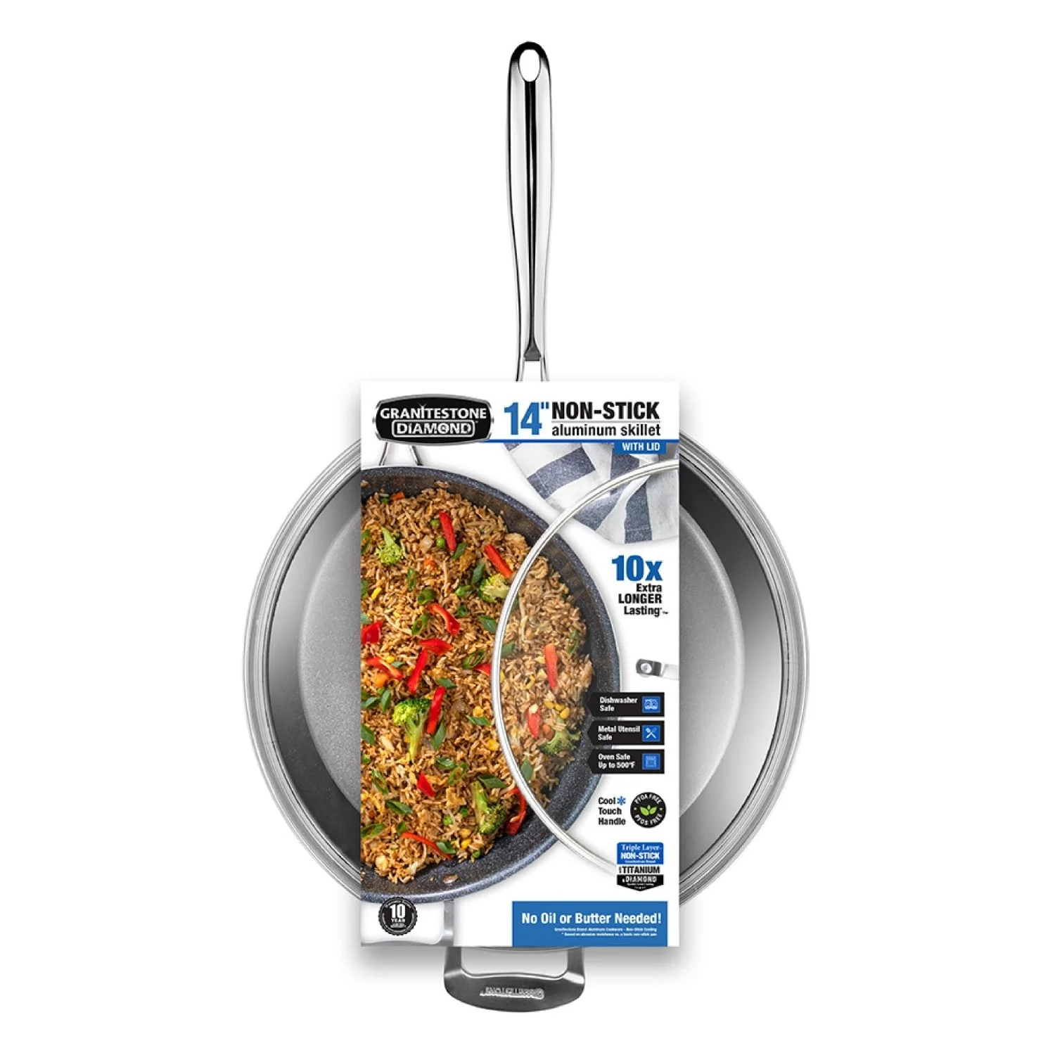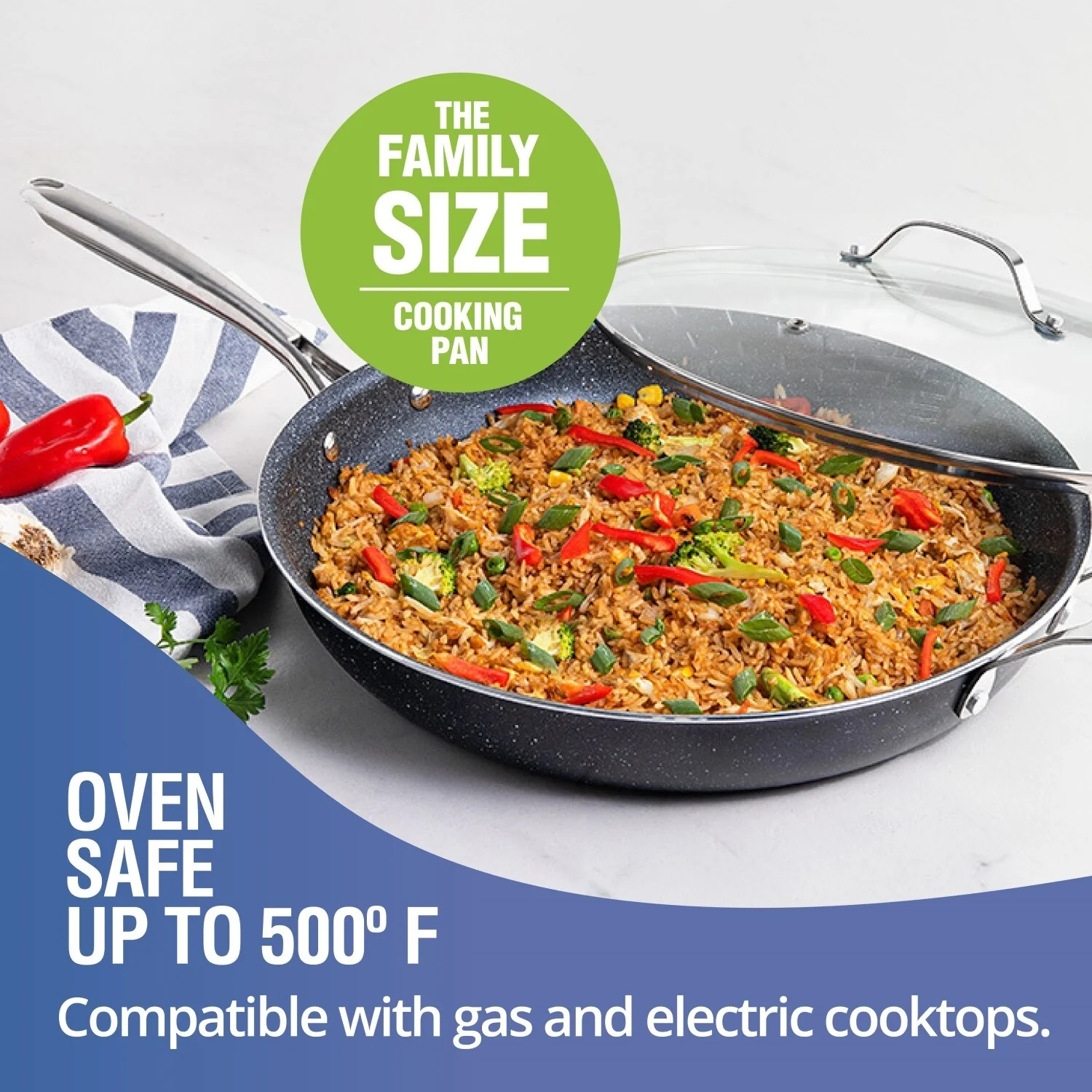 - Family-Sized and Functional: Extra-wide 14' size with deep sides is perfect for one-pan dinners, stir fries, and searing meats. Helper handle and glass lid add stability and control.