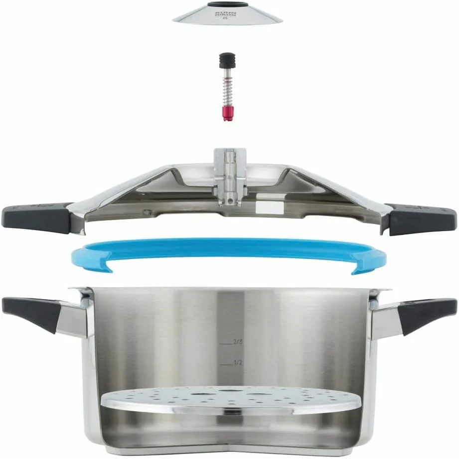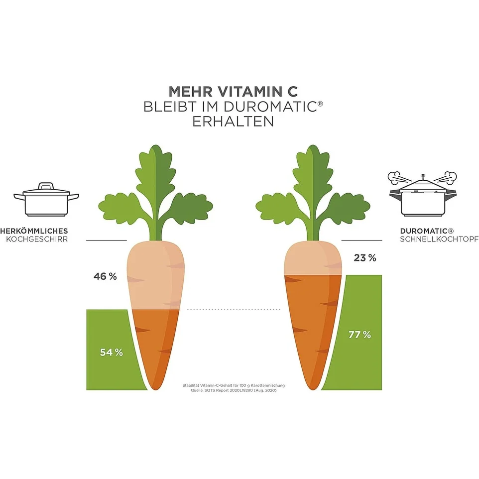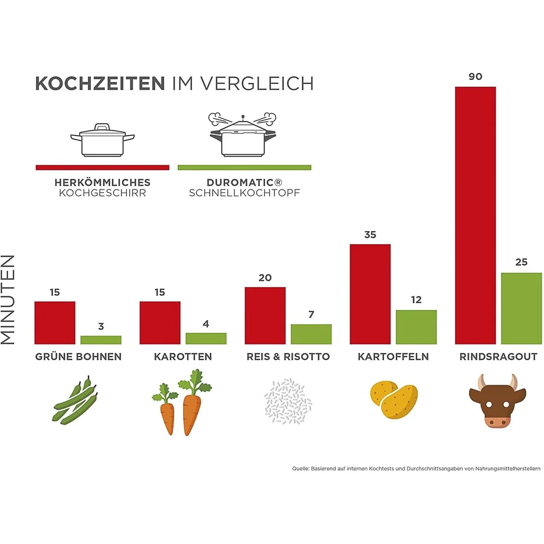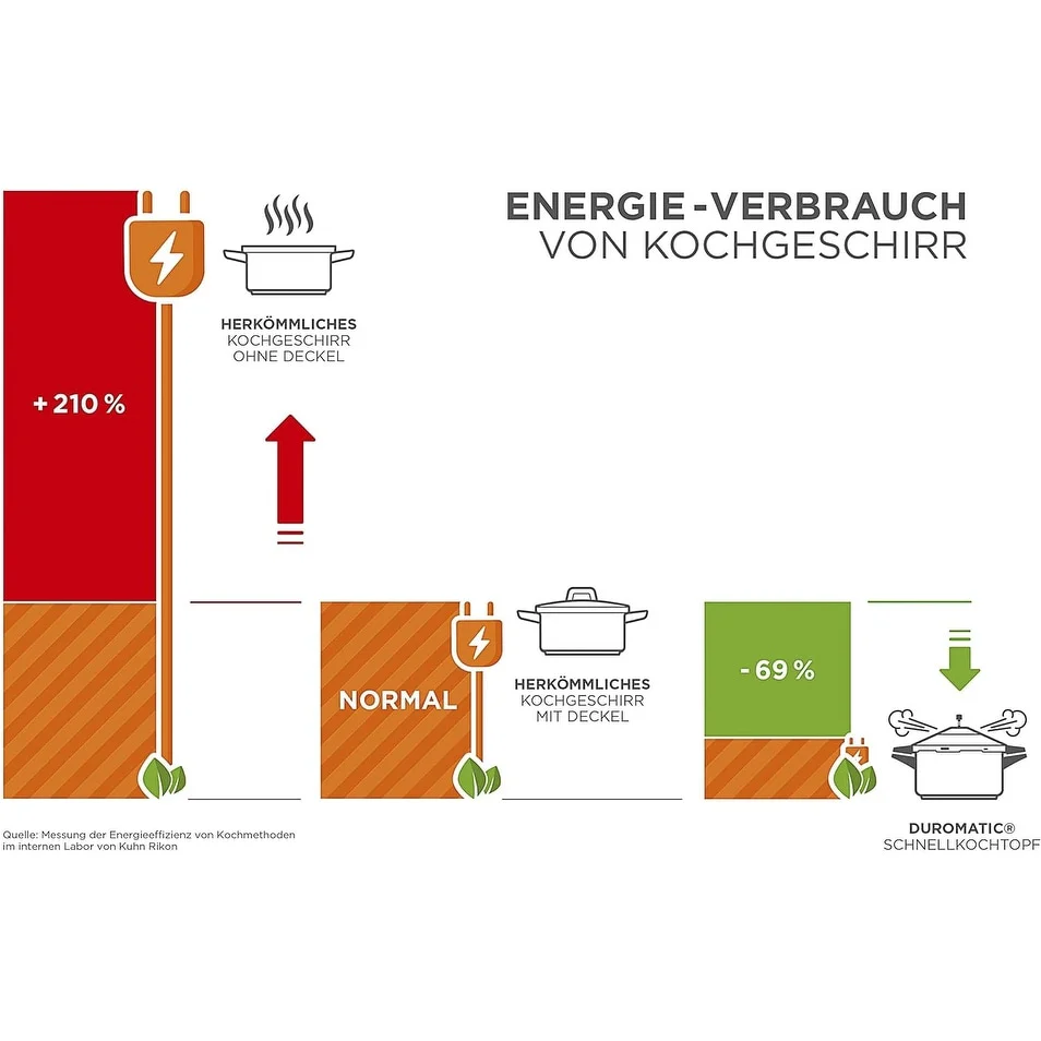 If cooking with a pressure cooker sounds old-fashioned, think again. Great strides have enhanced the Duromatic since its inception in 1949. Swiss company Kuhn Rikon has made the pressure cooker quieter, safer, and a smart option in today's world, given how quickly it cooks and how much energy it saves. Pressure cookers are rapidly gaining in popularity, and this one is an exceptional model crafted in Switzerland. You'll find such foods as rice, grains, stews, poultry, and vegetables cook in just one-third the time of conventional methods, and retain vital nutrients. Choose from a variety of sizes to meet any household's needs. By saving 70 percent of the gas or electricity normally used in conventional cooking, the pressure cooker can pay for itself in just months.