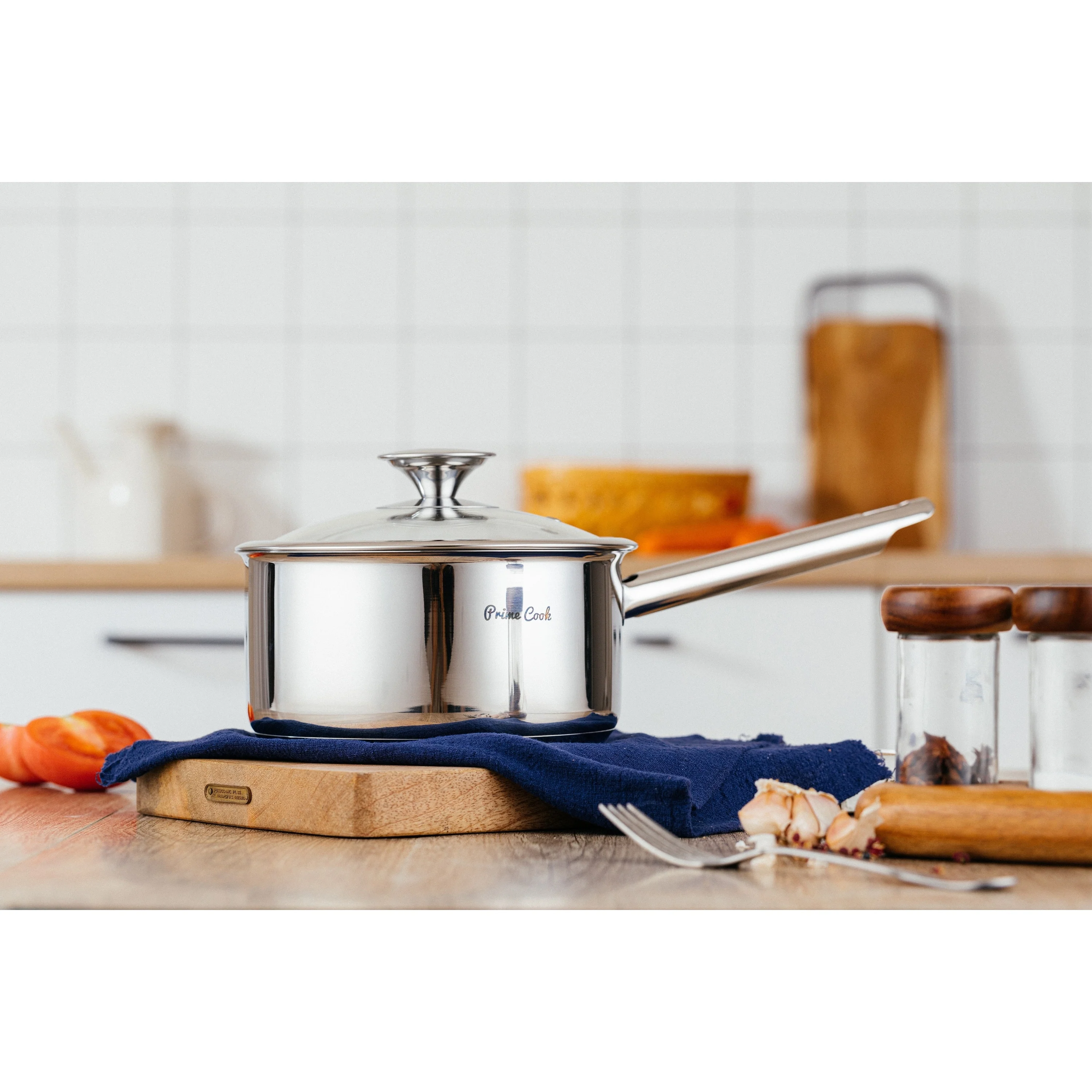 Tri-ply stainless steel, pure aluminum core between stainless steel layers for the whole body. Special matte finish inside to prevent scratches over time, easy to monitor cooking & mirror finish outside for a beautiful look. Pour spouts on both sides of the rim for right and left-handed. Heavy-duty multi clad construction. No heat spots, even heat distribution. The ergonomic handle stays cool when the pan is hot. Induction pan works on gas, electric, halogen cooktops. Made only with high quality 18/10 food-grade stainless steel, highly durable, resistant to rust, stain, corrosion, or crack. Designed to look elegant in the kitchen.