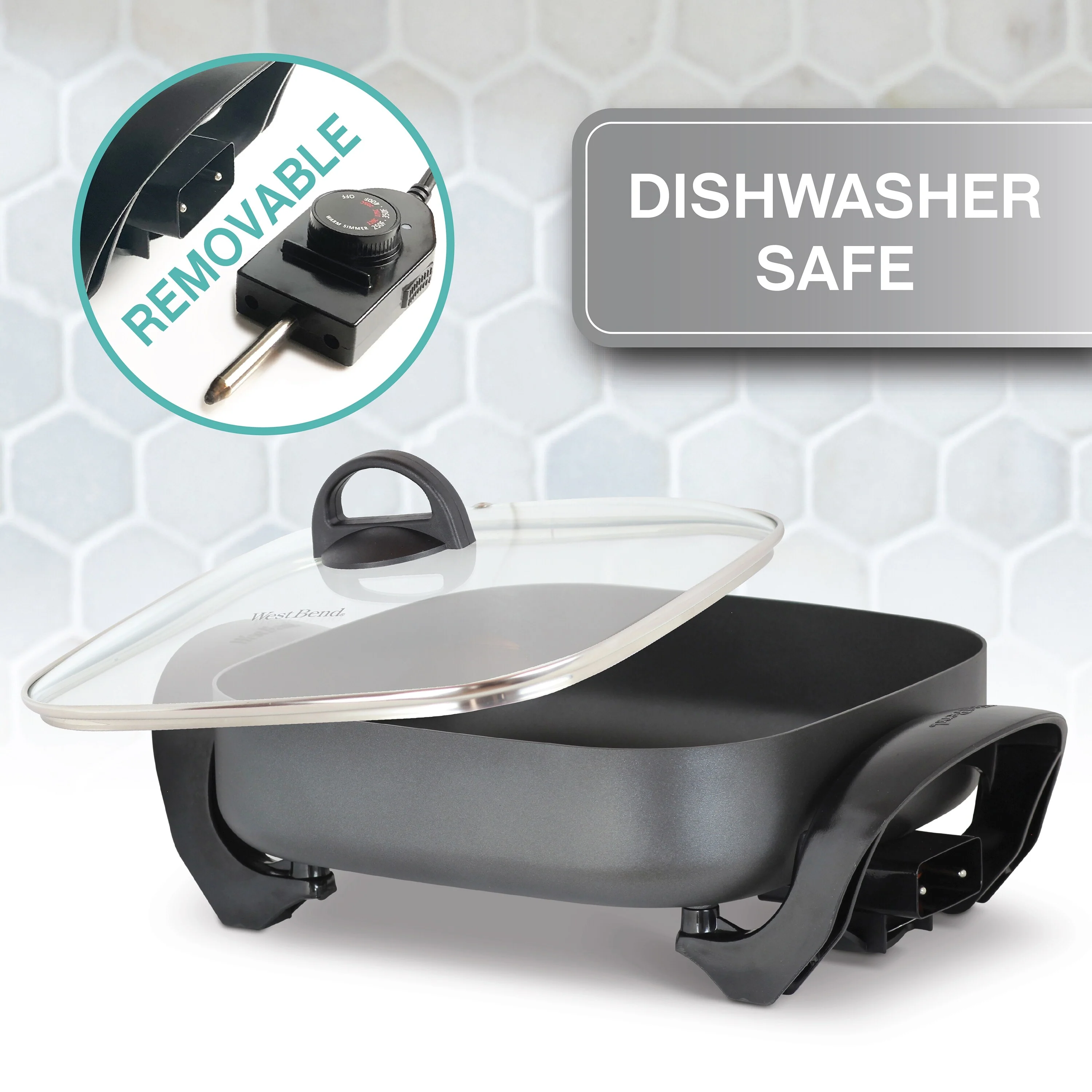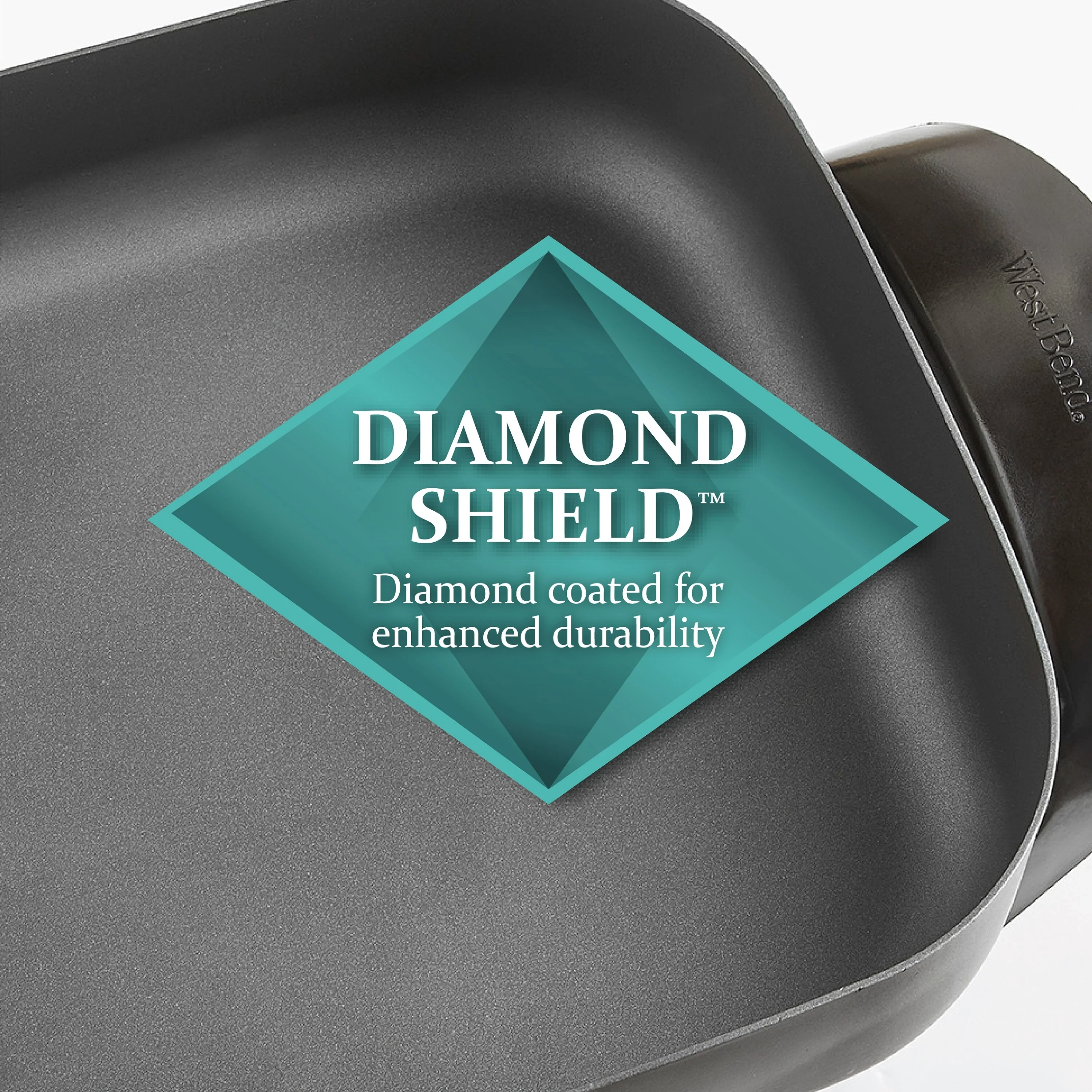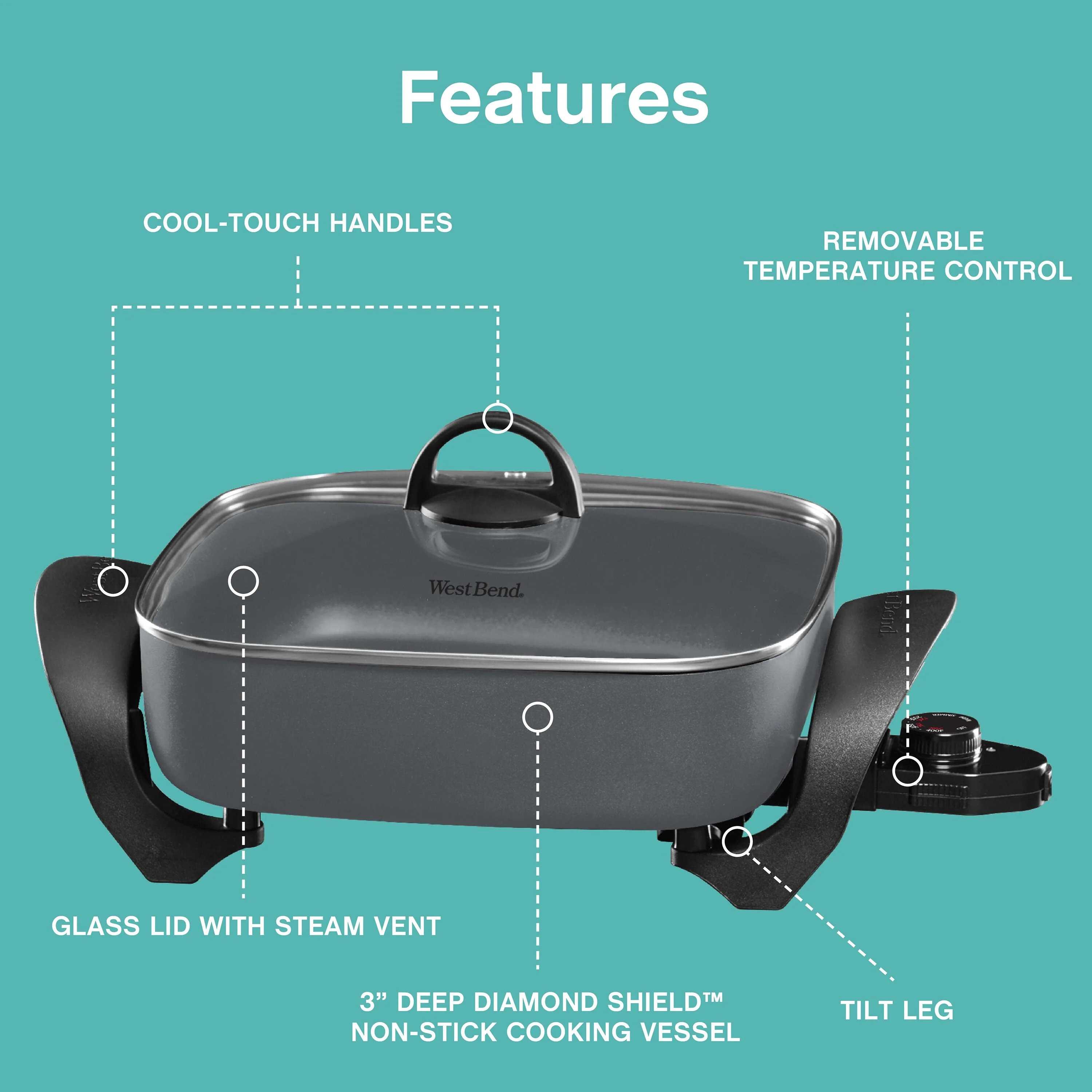 The West Bend 12in. Electric Skillet provides easy cooking and simple serving for everyday family meals, special occasion entertaining and so much more. The unique PFOA-free, multi-layer Diamond Shield non-stick surface is infused with diamond particles for a strong coating that is scratch-resistant and prevents food from sticking for easier cooking and faster cleaning. With a generous 3-inch depth and 12-inch by 12-inch square cooking area, this skillet can effortlessly cook an entire meal at once—in one pan. The adjustable, removable thermostat precisely controls temperature for cooking and warming, then removes for skillet cleaning. Tempered glass lid has a steam vent to eliminate condensation for more even cooking. Unique tilt leg and grease channel for healthier cooking. Convenient and safe, the handles stay cool to the touch so you can confidently pick up for serving or tend to cooking food. Skillet and cover are dishwasher safe.