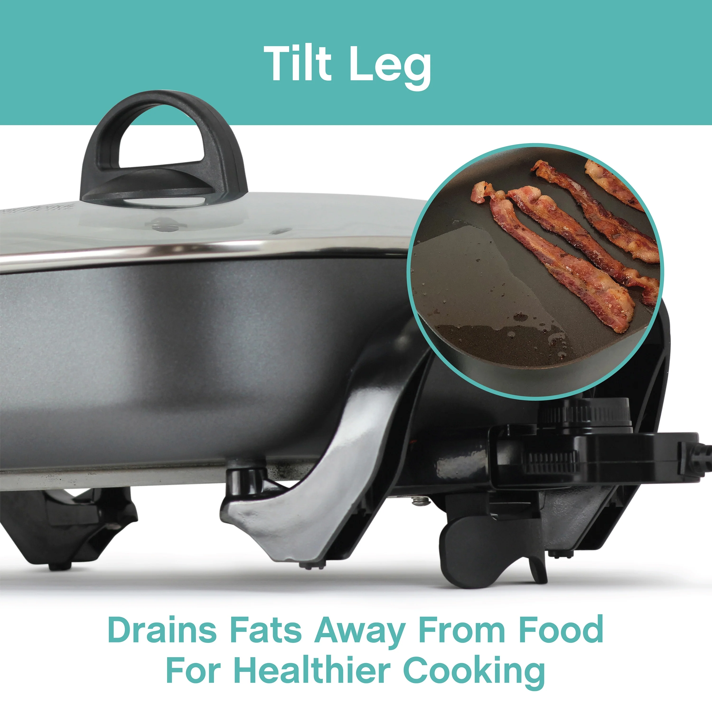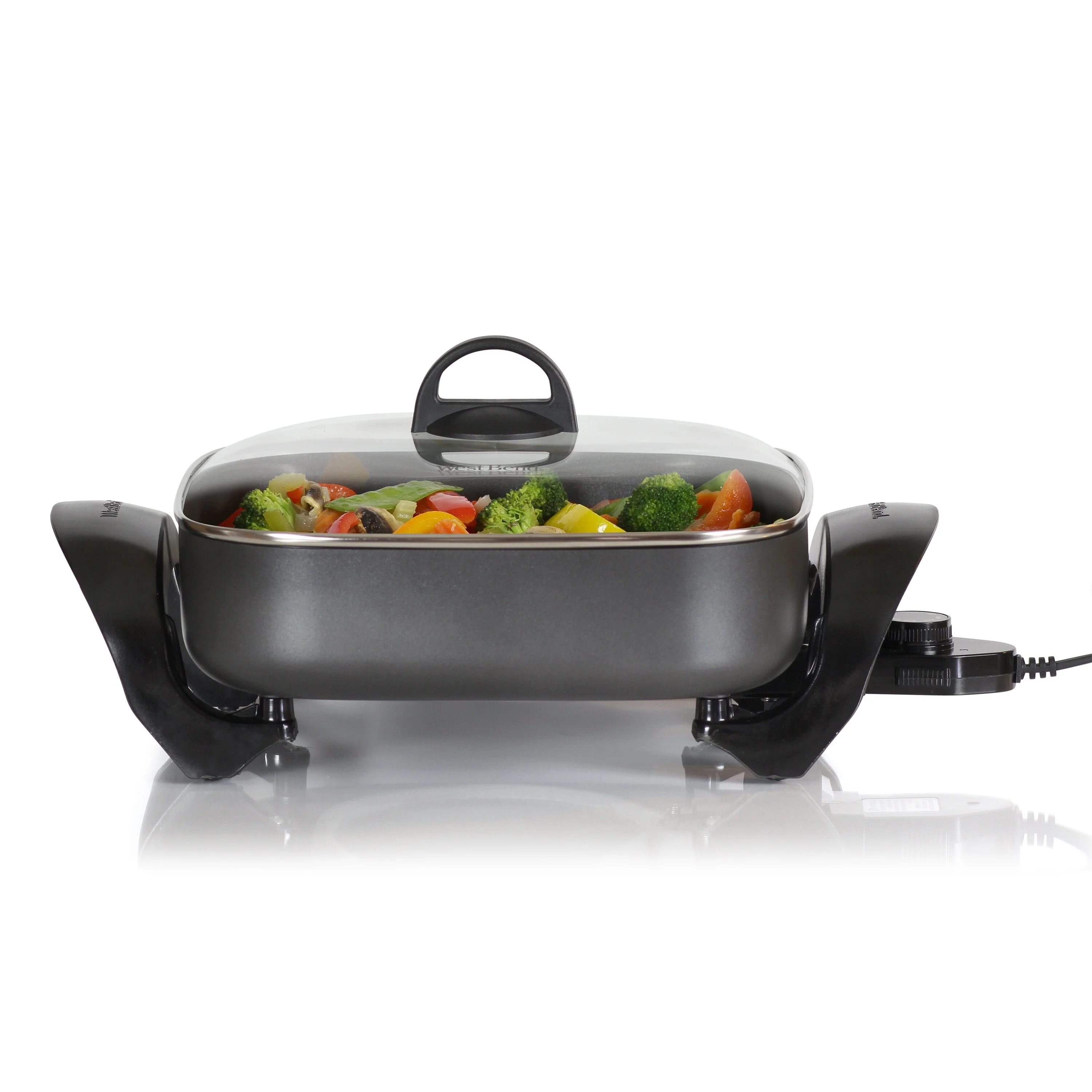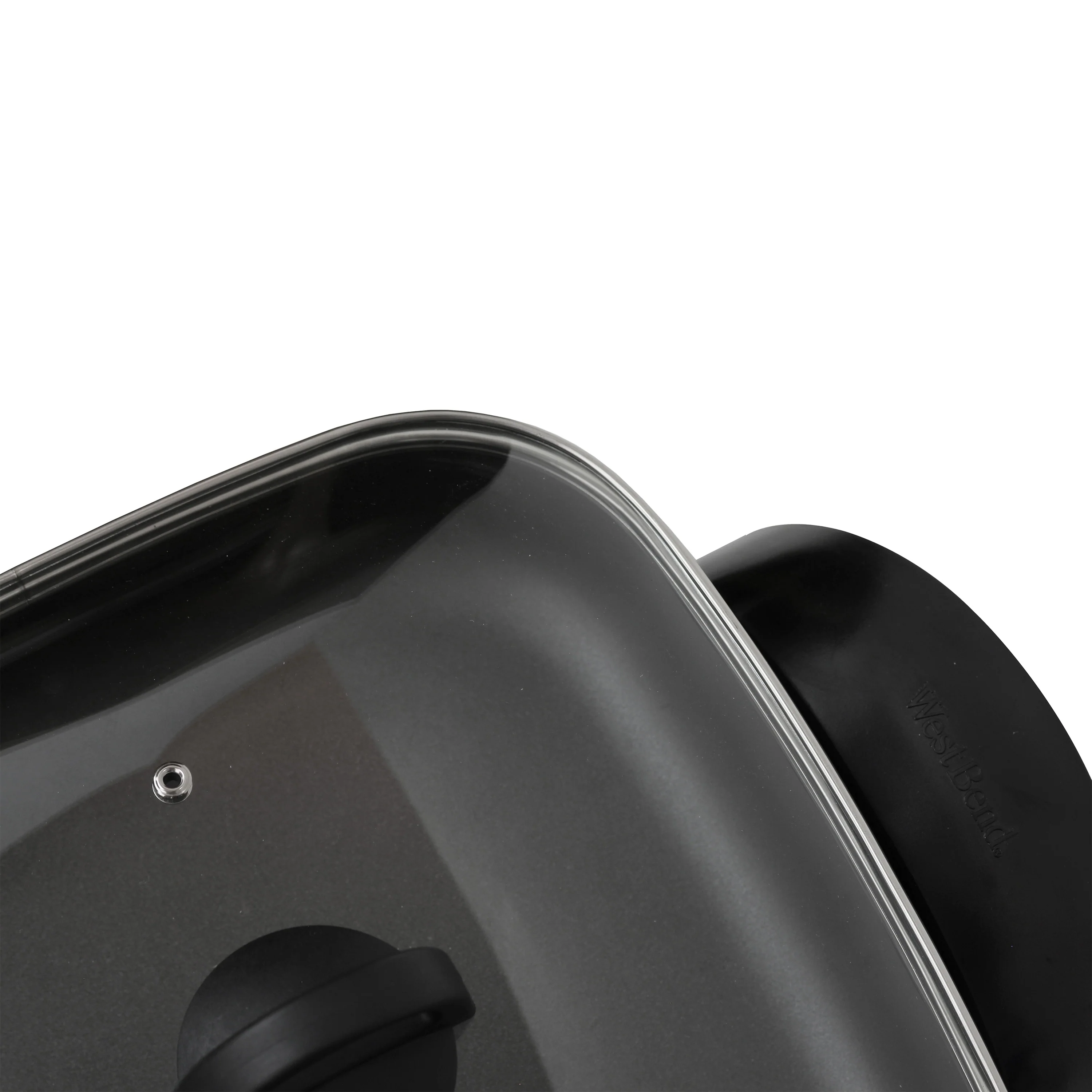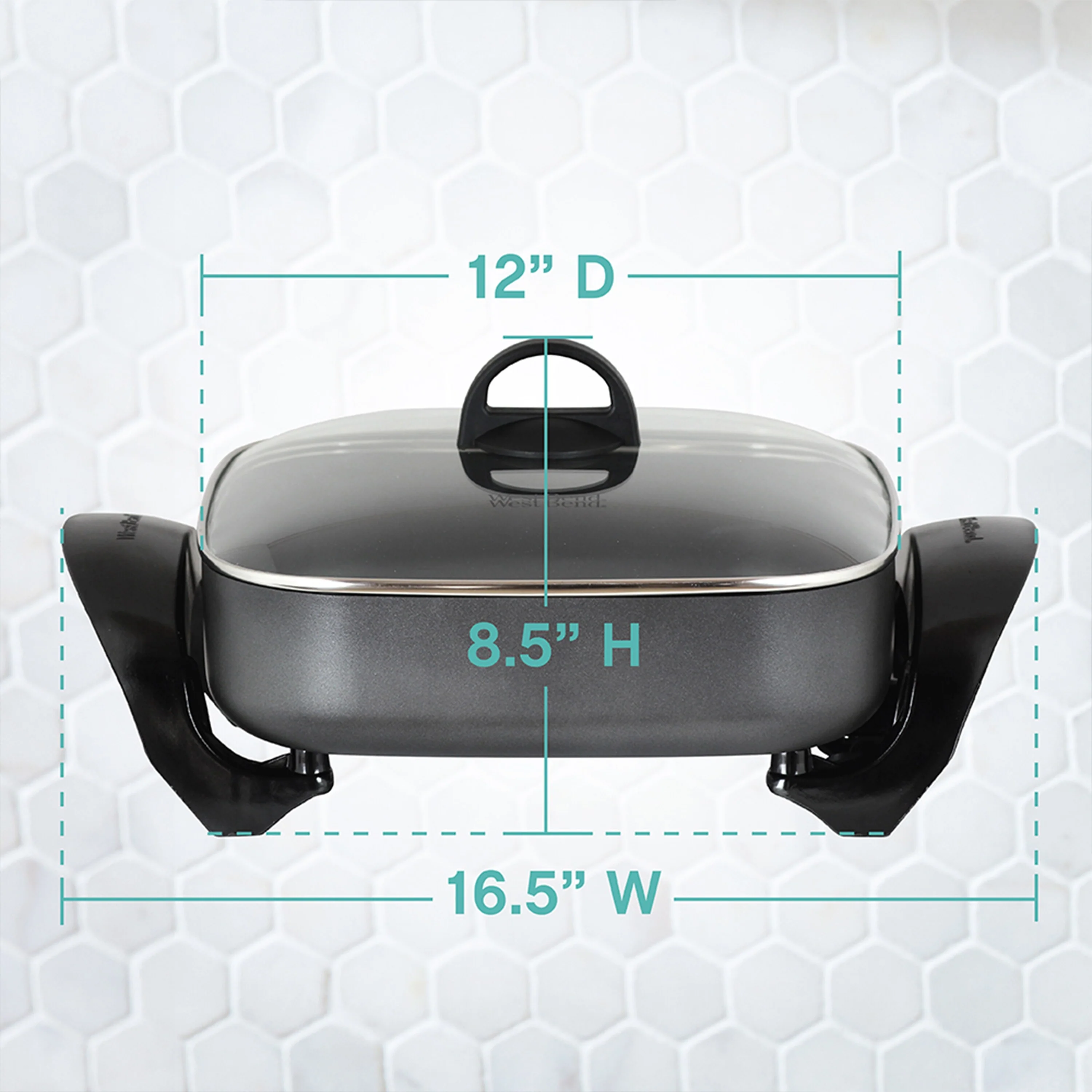 The West Bend 12in. Electric Skillet provides easy cooking and simple serving for everyday family meals, special occasion entertaining and so much more. The unique PFOA-free, multi-layer Diamond Shield non-stick surface is infused with diamond particles for a strong coating that is scratch-resistant and prevents food from sticking for easier cooking and faster cleaning. With a generous 3-inch depth and 12-inch by 12-inch square cooking area, this skillet can effortlessly cook an entire meal at once—in one pan. The adjustable, removable thermostat precisely controls temperature for cooking and warming, then removes for skillet cleaning. Tempered glass lid has a steam vent to eliminate condensation for more even cooking. Unique tilt leg and grease channel for healthier cooking. Convenient and safe, the handles stay cool to the touch so you can confidently pick up for serving or tend to cooking food. Skillet and cover are dishwasher safe.