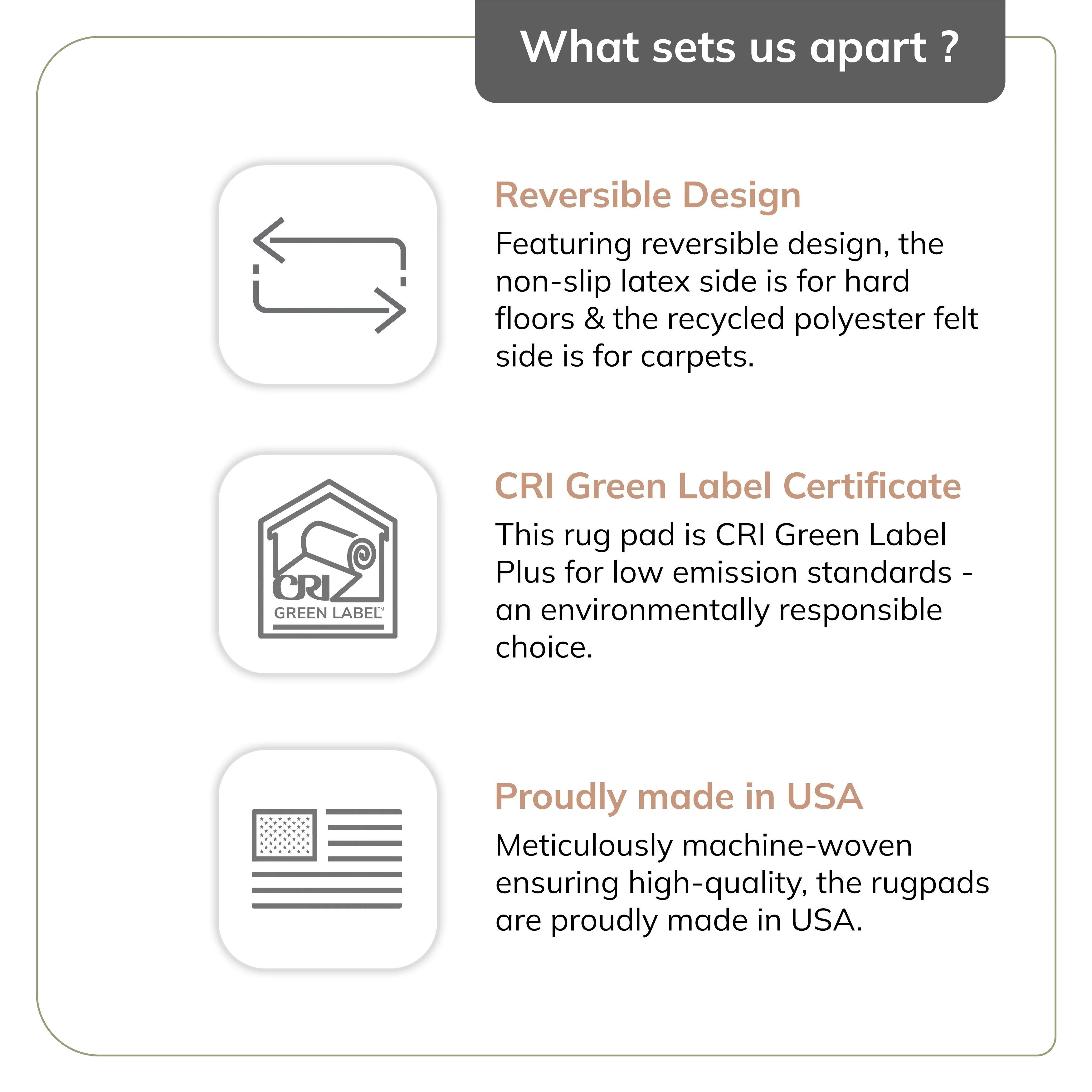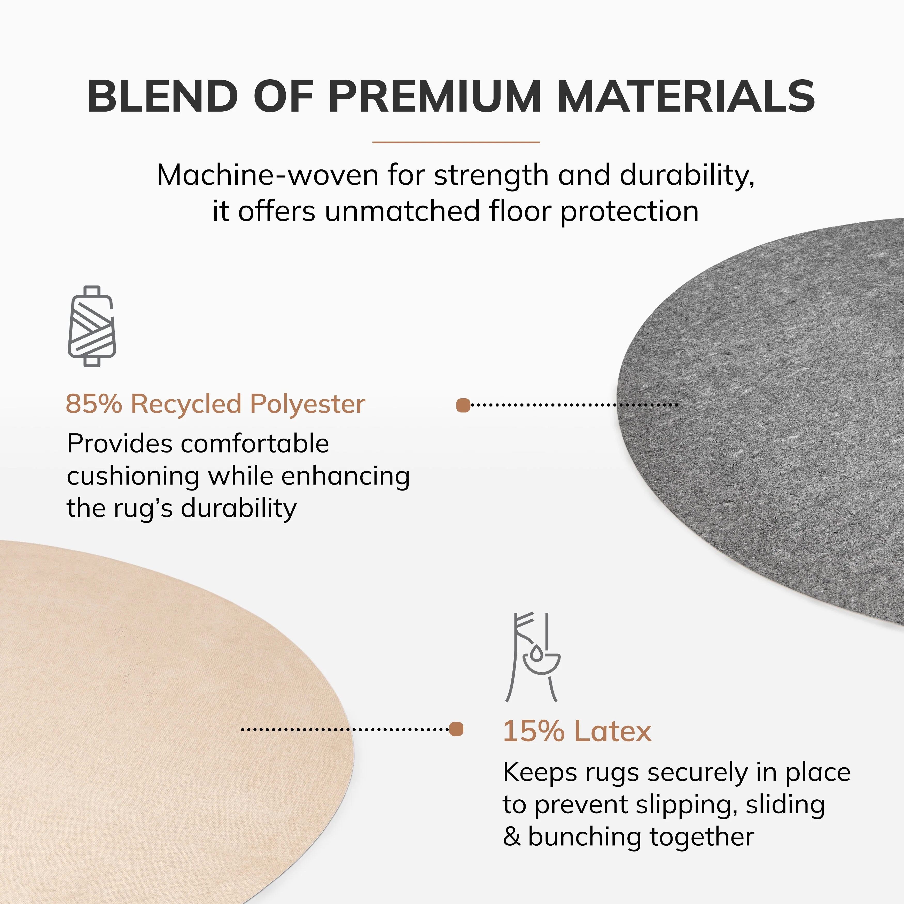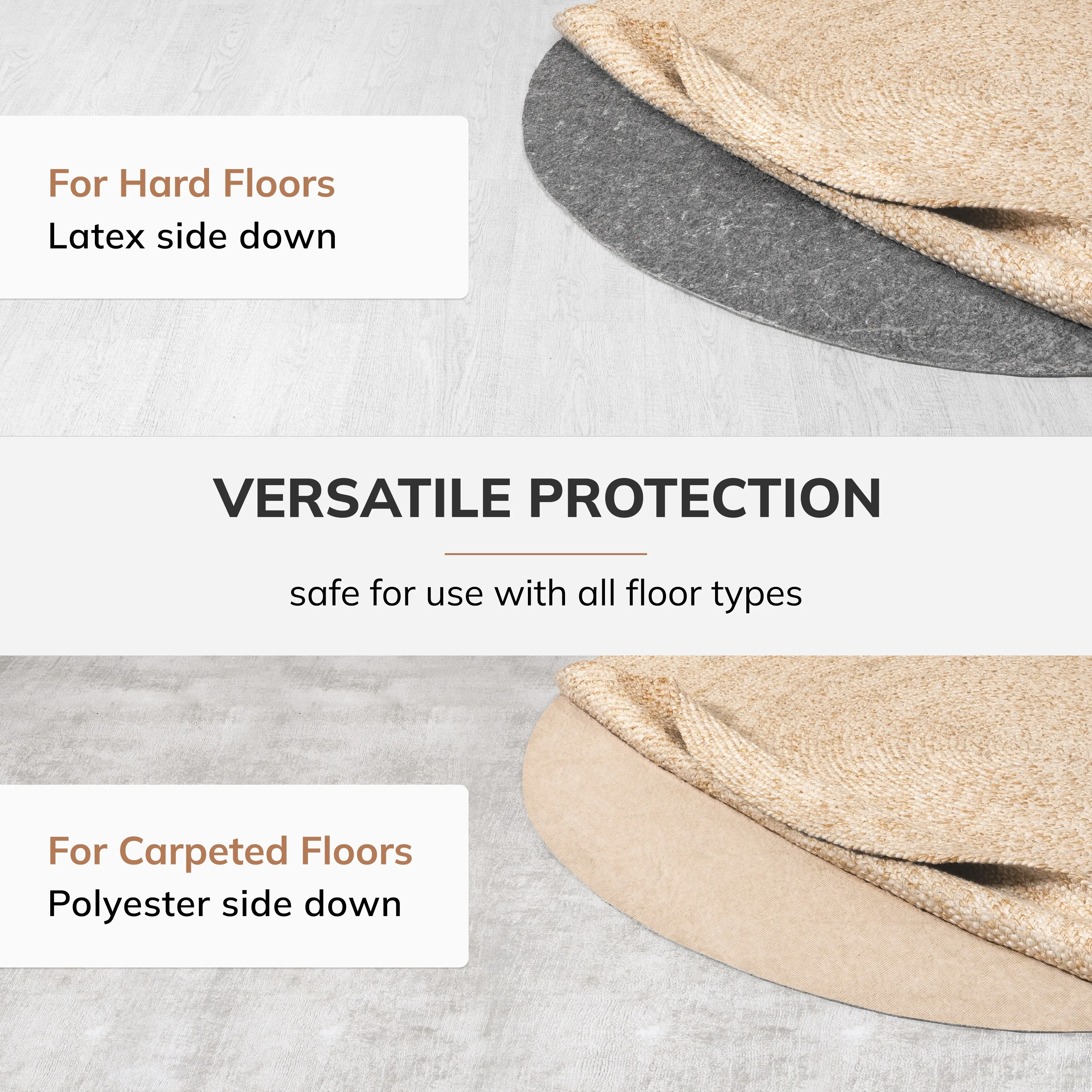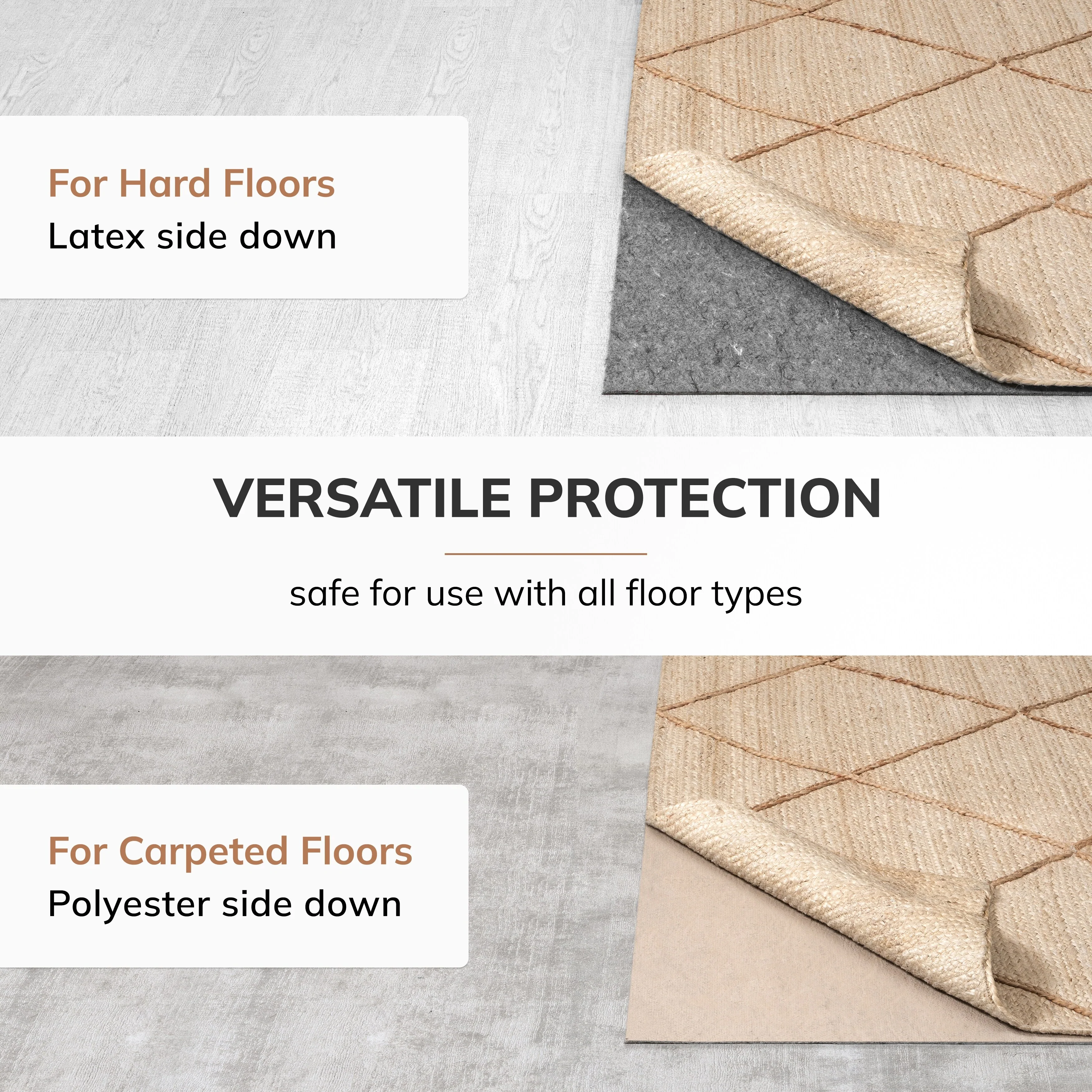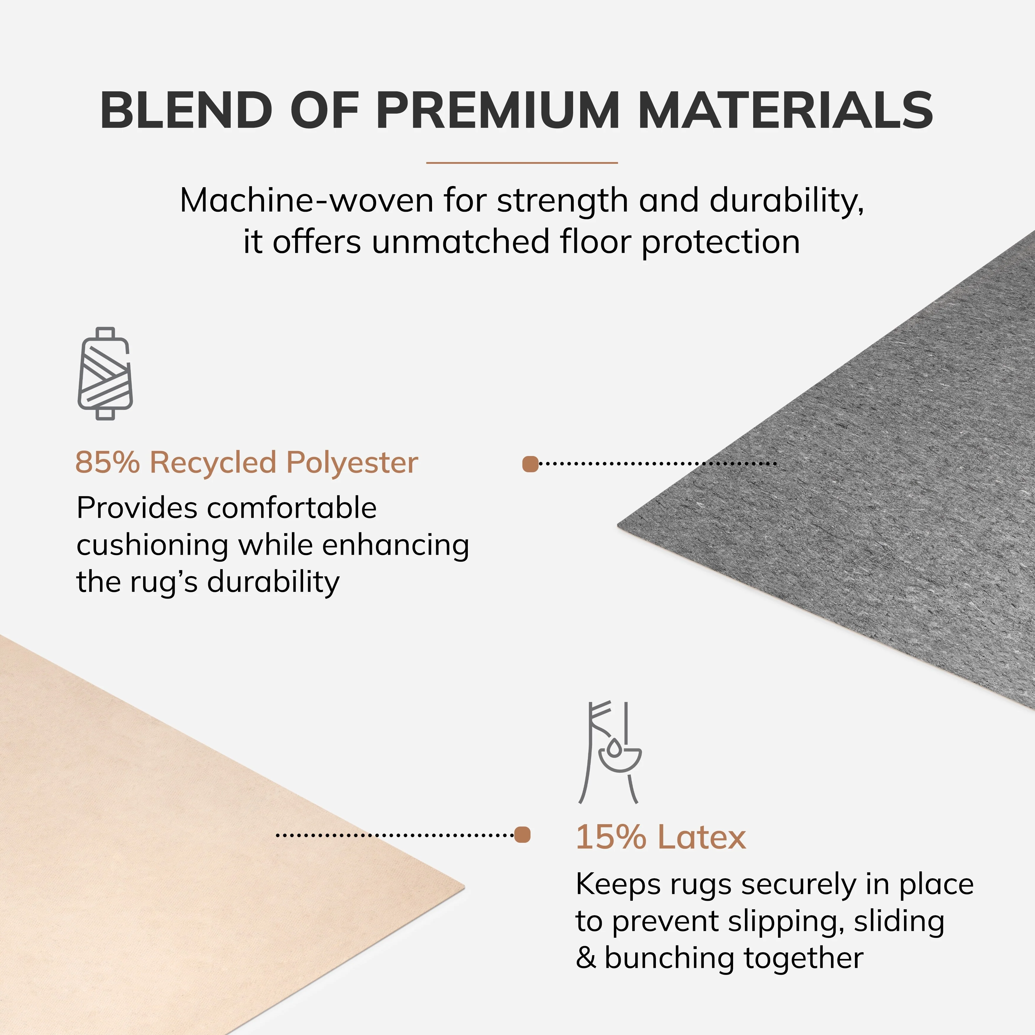 Elevate your rug game with the Jani Premium All-Surface Non-Slip Rug Pad (5' x 8', Gray/Tan, Rectangle). This versatile rug pad features a reversible design, offering a non-slip latex side for hard floors and a polyester felt side for carpets. It provides unmatched cushioning and protection for your rugs and floors. CRI Green Label Plus Certified for sustainability, this rug pad meets stringent criteria for low emissions. Easily trimmable with scissors for a custom fit, it ensures both style and safety in your home decor.