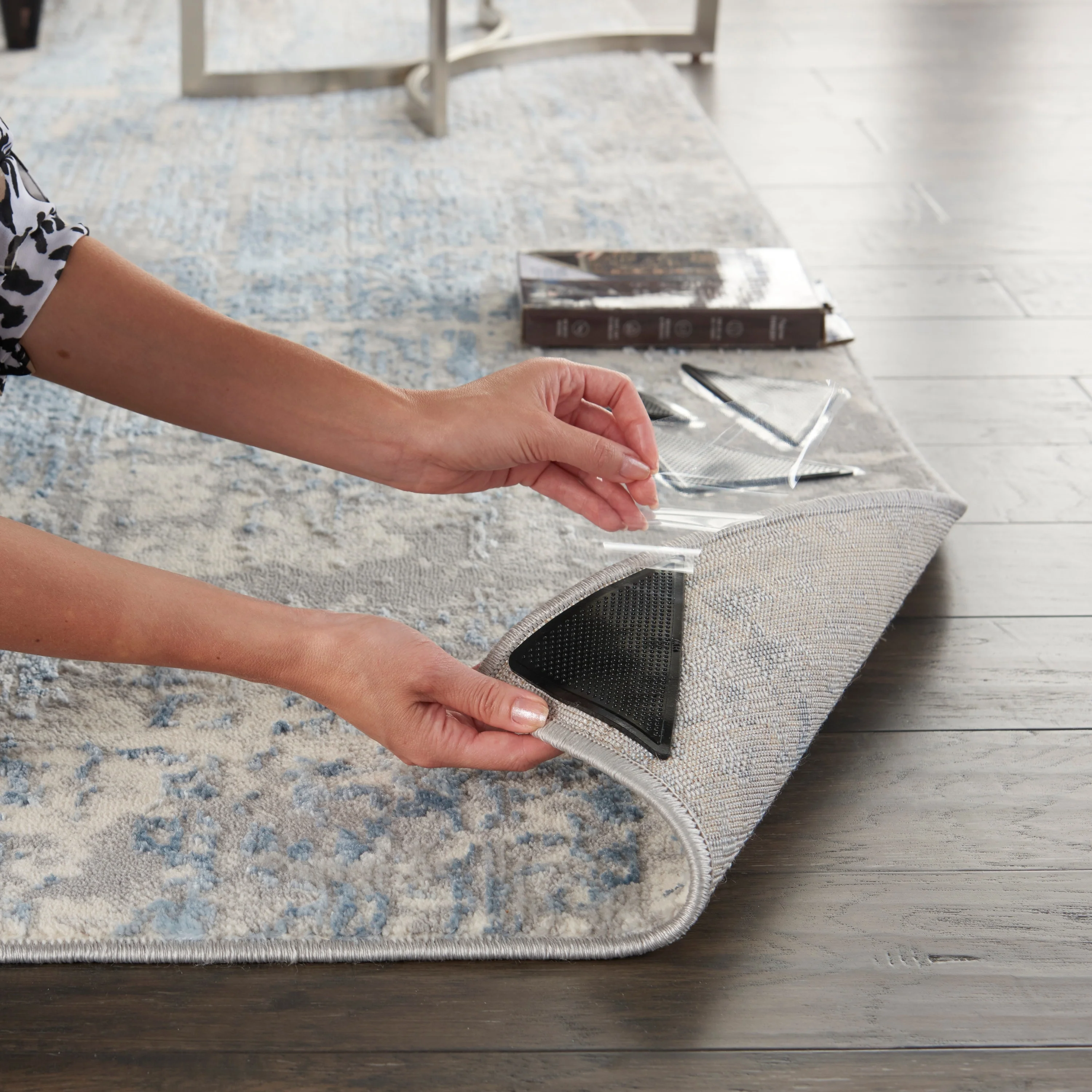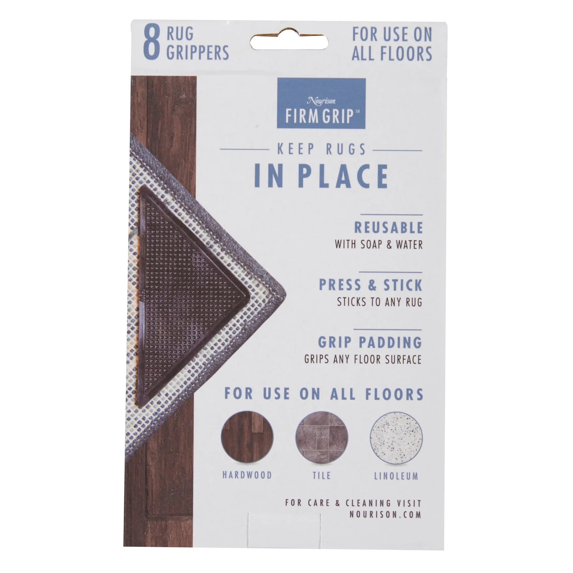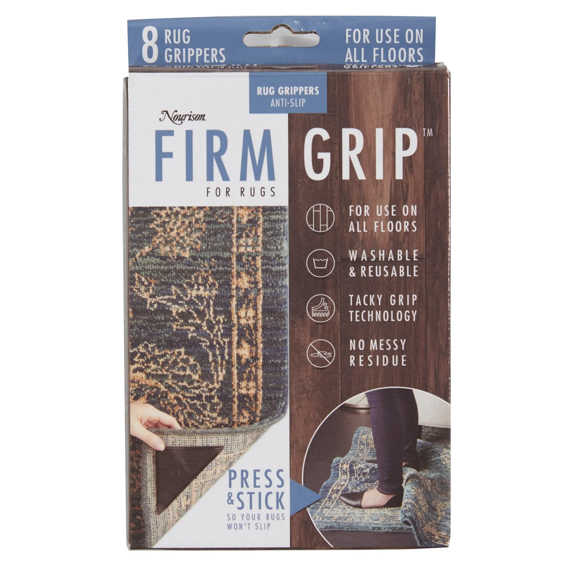 Keep your rug in place with Nourison's Firm Grip Anti-Slip Rug Gripper. These 8 corner squares feature tacky grip technology that prevents your rug from slipping or curling at the ends. Suitable for use on all types of floors, including hardwood, tile, and linoleum, these grippers are washable and reusable. Plus, they leave no residue or mess behind. Applying them is easy - simply fold the rug to expose the backing, apply the grippers to the corners, and voila!