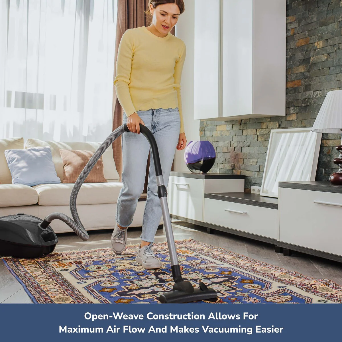 - Broad open-weave construction allows air flow and makes vacuuming easier.